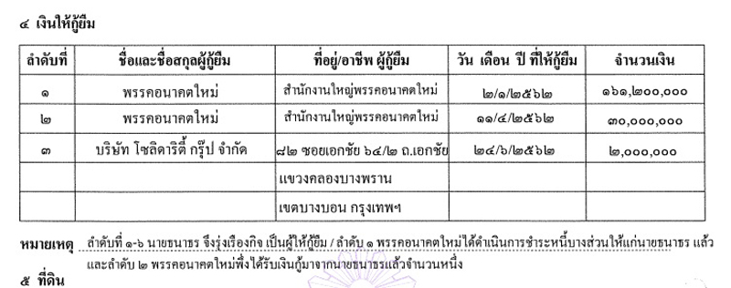 นอกจากนี้ยังปล่อยกู้บริษัท โซลิดาริตี้ กรุ๊ป จำกัด เมื่อวันที่ 24 มิ.ย. 2562 มูลค่า 2 ล้านบาท และปล่อยกู้แก่บุคคล 3 ราย ได้แก่ นายอุดม พัชรพนาวีร์ เมื่อวันที่ 17 ก.พ. 2559 มูลค่า 4 แสนบาท นายภัทร พงศ์ คงวิจิตร เมื่อวันที่ 9 มี.ค. 2553 มูลค่า 1 ล้านบาท และนายชูชัย มุ่งเจริญพร อดีต ส.ส.สุรินทร์ พรรคเพื่อไทย ทำสัญญาเมื่อวันที่ 17 ก.ย. 2557 มูลค่า 2.3 ล้านบาท