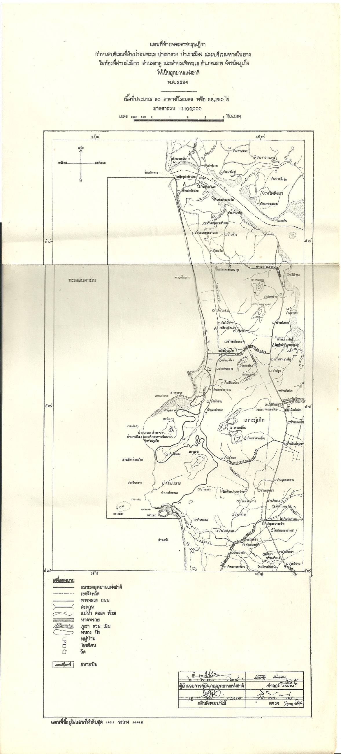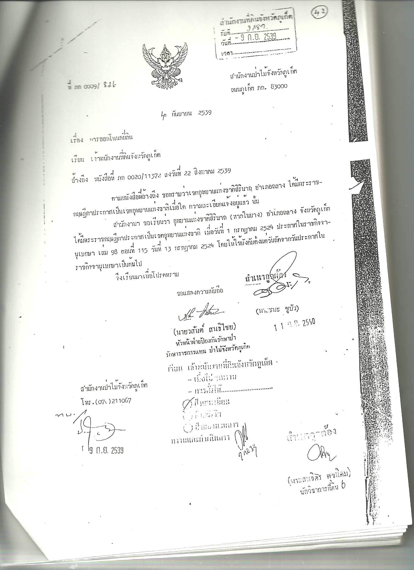 ฉบับแรก หนังสือเลขที่ ภก 0009/826 วันที่ 4 ก.ย.39 นายวสันต์ สนธิไชย หัวหน้าฝ่ายป้องกันรักษาป่า รักษาราชการแทน ป่าไม้จังหวัดภูเก็ต ถึงเจ้าพนักงานที่ดินจังหวัดภูเก็ต แจ้งว่า ตามที่ขอให้ตรวจสอบว่าเขตอุทยานแห่งชาติสิรินาถ (หาดในยาง) อำเภอถลาง ได้มีพระราชกฤษฎีกาประกาศเป็นเขตอุทยานแห่งชาติเมื่อใด