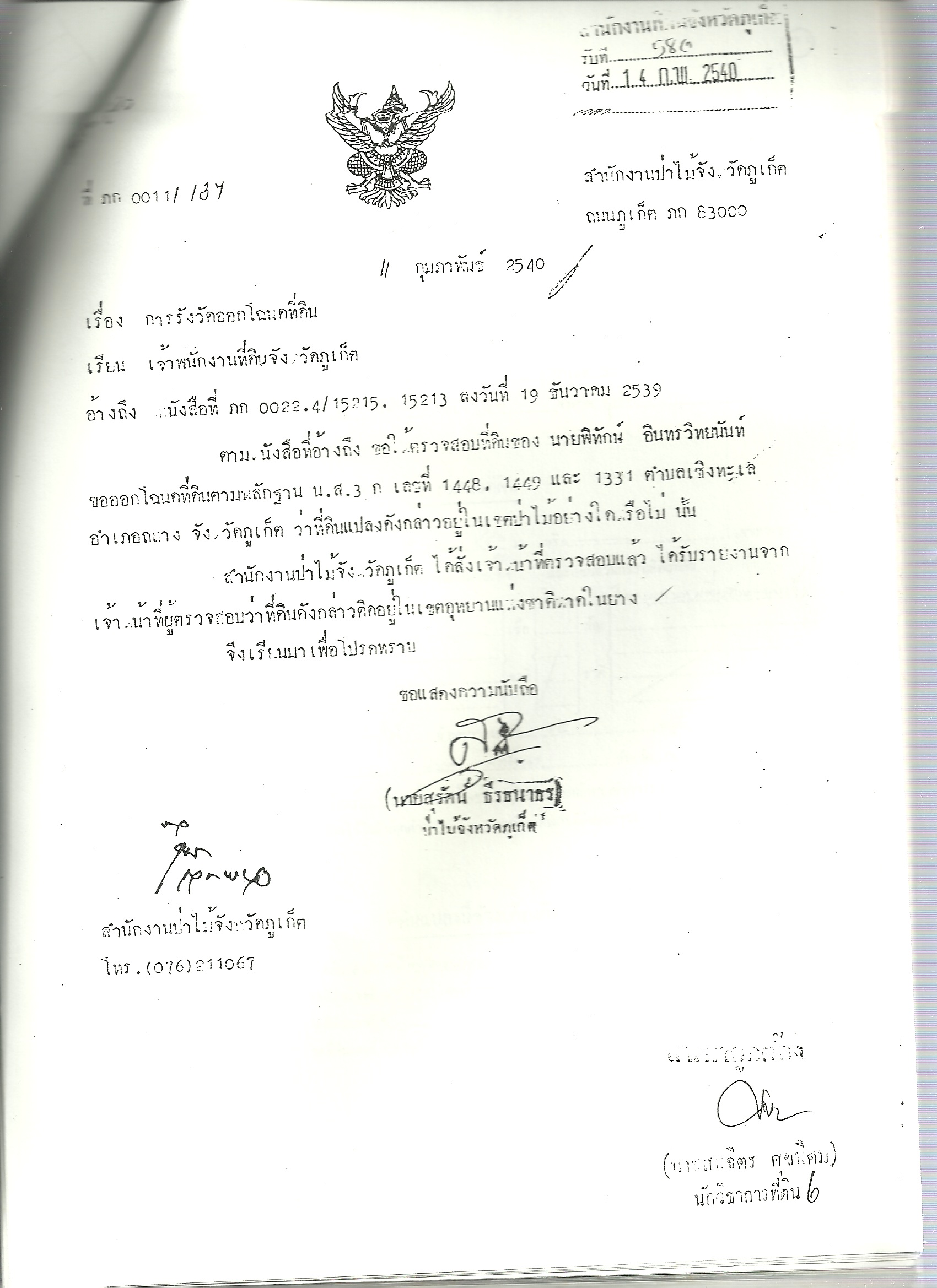 ฉบับที่สอง หนังสือเลขที่ ภก 0011/137 วันที่ 11 กุมภาพันธ์ 2540 นายสุรัตน์ ธีรธนาธร ป่าไม้จังหวัดภูเก็ต ถึงเจ้าพนักงานที่ดินจังหวัดภูเก็ต อ้างถึงขอให้ตรวจสอบที่ดินของนายพิทักษ์ อินทรวิทยนันท์ ขอออกโฉนดที่ดิน ตามหลักฐาน น.ส.3 ก เลขที่ 1448,1449 และ 1331 ต.เชิงทะเล อ.ถลาง จ.ภูเก็ต ว่าที่ดินแปลงดังกล่าวอยู่ในเขตป่าไม้อย่างใดหรือไม่นั้น
