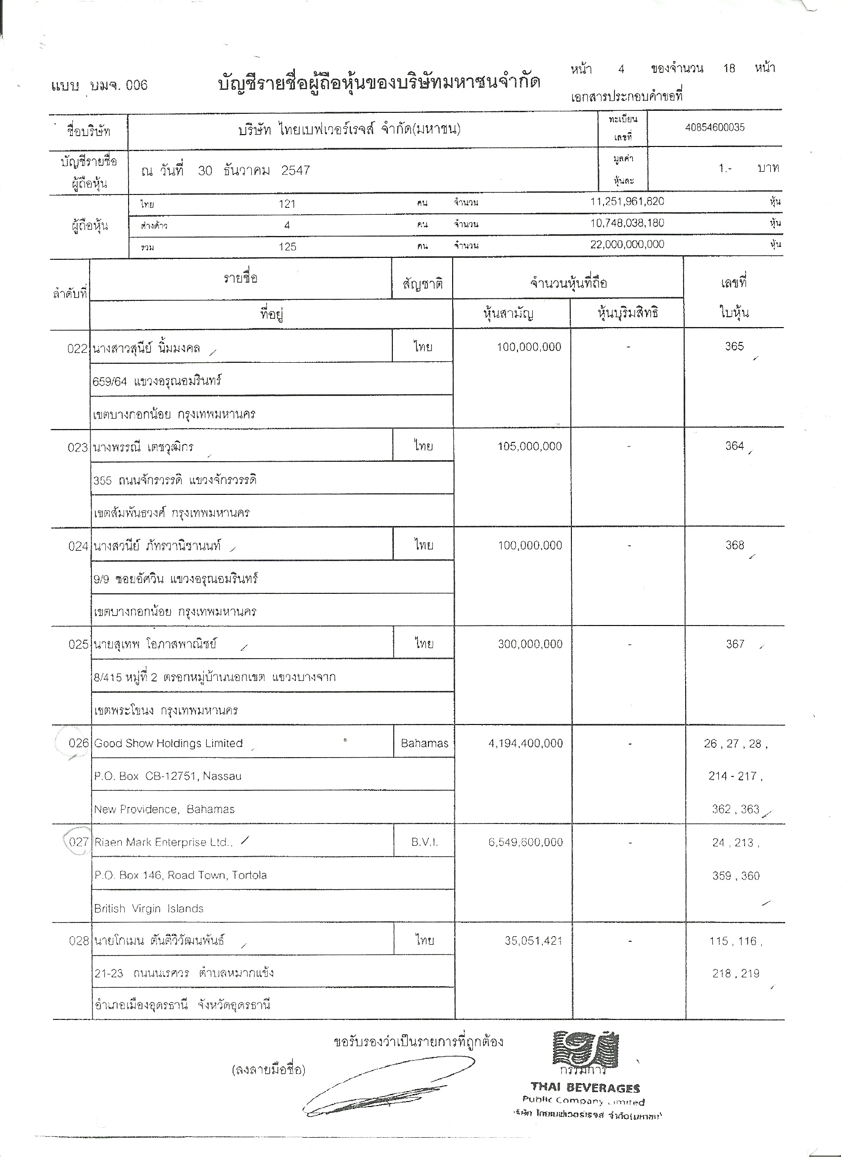3.LANCENT ASSOCIATES LTD ถือหุ้น บมจ.ไทยเบฟเวอร์เรจส์ 1,048,600,000 หุ้น (29 พ.ค.47)หุ้นละ 1 บาท มูลค่า 1,048.6 ล้านบาท