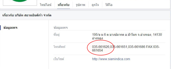 (หมายเลขโทรศัพท์ในเฟซบุ๊ก บ.สยามอินดิก้า)