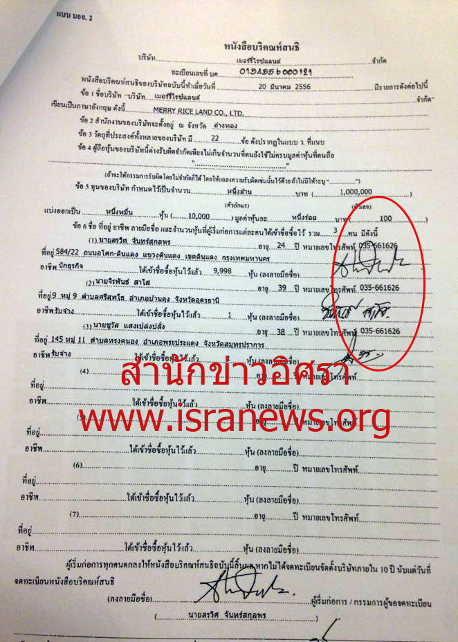 เมื่อถามว่า บริษัทเมอร์รี่ไรซ์แลนด์ จำกัด มีอยู่เลขที่เดียวกับบริษัทสยามอินดิก้า ใช่หรือไม่ เจ้าหน้าที่บริษัทสยามอินดิก้าฯ ตอบว่า บริษัทเมอร์รี่ไรซ์แลนด์อยู่อาคารข้างๆ บริษัทสยามอินดิก้า ช่วงจดทะเบียนจัดตั้งแจ้งที่อยู่เดียวกันไม่รู้เขาแจ้งเปลี่ยนหรือยัง"