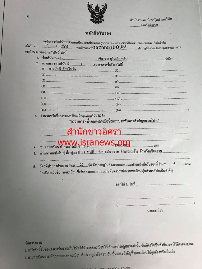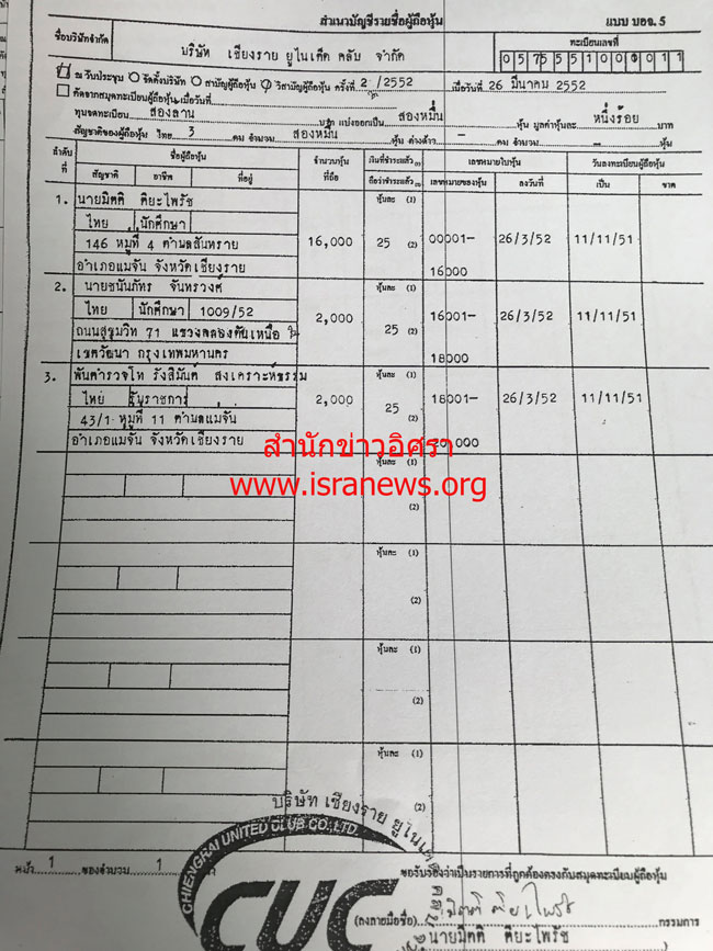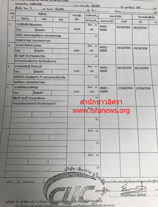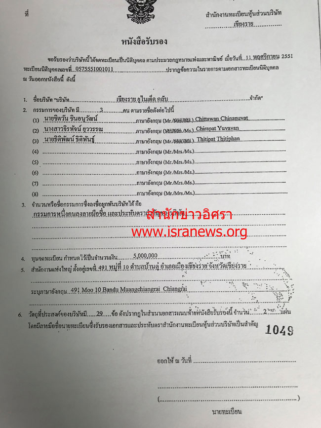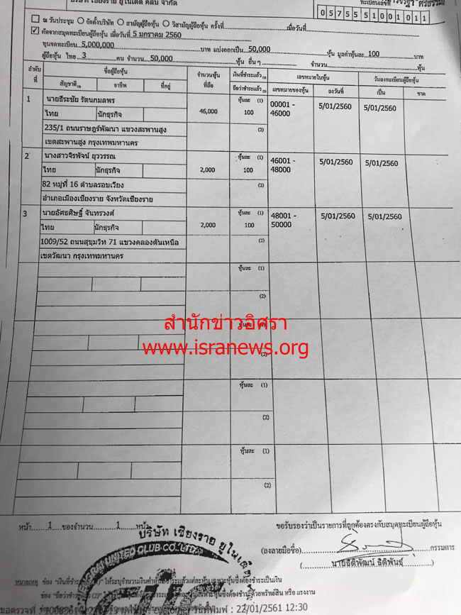 เพื่อให้สาธารณชนเห็นภาพข้อมูลเกี่ยวข้อง บริษัท เชียงราย ยูไนเต็ด คลับ จำกัด มากขึ้น สำนักข่าวอิศรา www.isranews.org ตรวจสอบเอกสารหลักฐานการจดทะเบียนจัดตั้งบริษัท เชียงราย ยูไนเต็ด คลับ จำกัด ที่แจ้งไว้กับกรมพัฒนาธุรกิจการค้า มานำเสนอแบบชัดๆ ดังนี้
