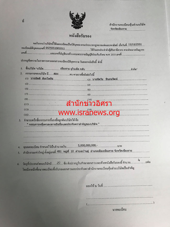 จากการตรวจสอบพบว่า ในช่วงจดทะเบียนจัดตั้งบริษัทฯ เมื่อวันที่ 11 พ.ย.2551 นายมิตติ ติยะไพรัช เป็นชื่อเป็นกรรมการผู้มีอำนาจ และผู้ถือหุ้นใหญ่แจ้งประเดิมทุน 1 ล้านบาท ตั้งอยู่เลขที่ 81 หมู่ที่ 7 ตำบลสันทราย อำเภอแม่จัน จังหวัดเชียงราย