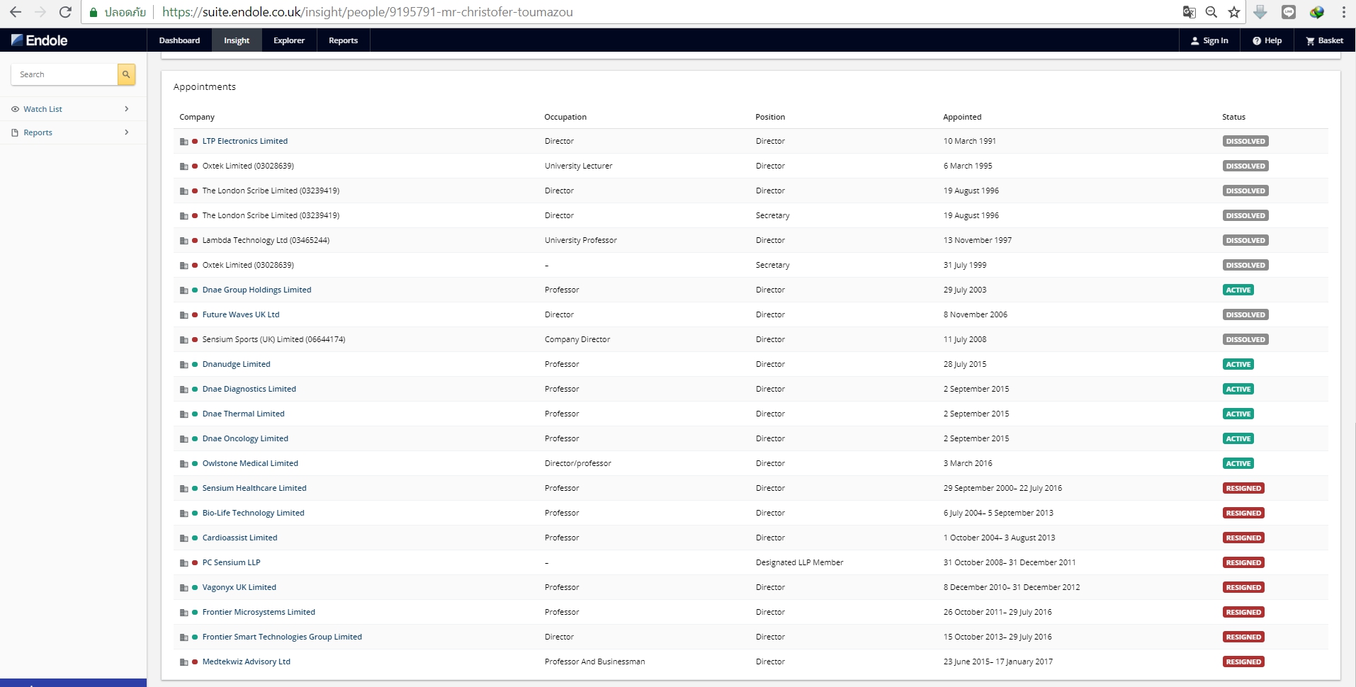 9.บริษัท Sensium Healthcare Limitedแจ้งจดทะเบียนเมื่อวันที่ 7 พ.ย. 2543 ว่าทำธุรกิจในประเภทกิจกรรมทางวิทยาศาสตร์ โดยปัจจุบันยังคงทำธุรกิจอยู่ ส่วนนาย Christofer Toumazou ได้ออกจากตำแหน่งไปเมื่อวันที่ 22 ก.ค. 2559