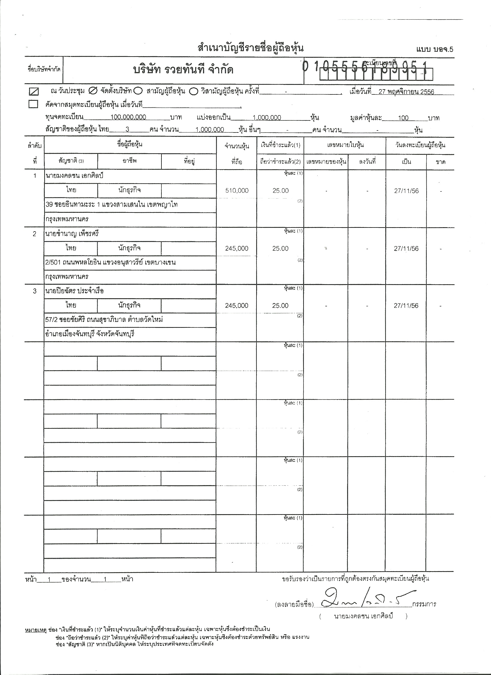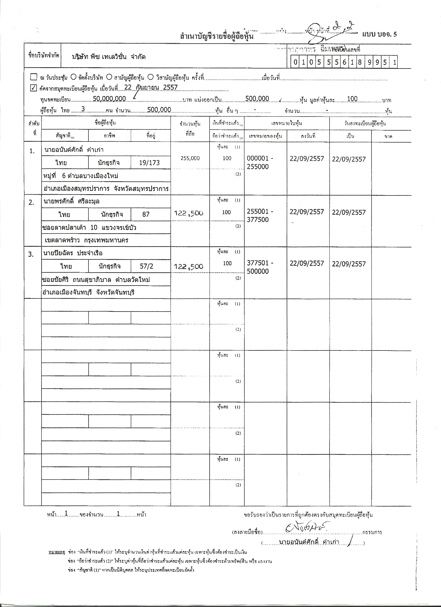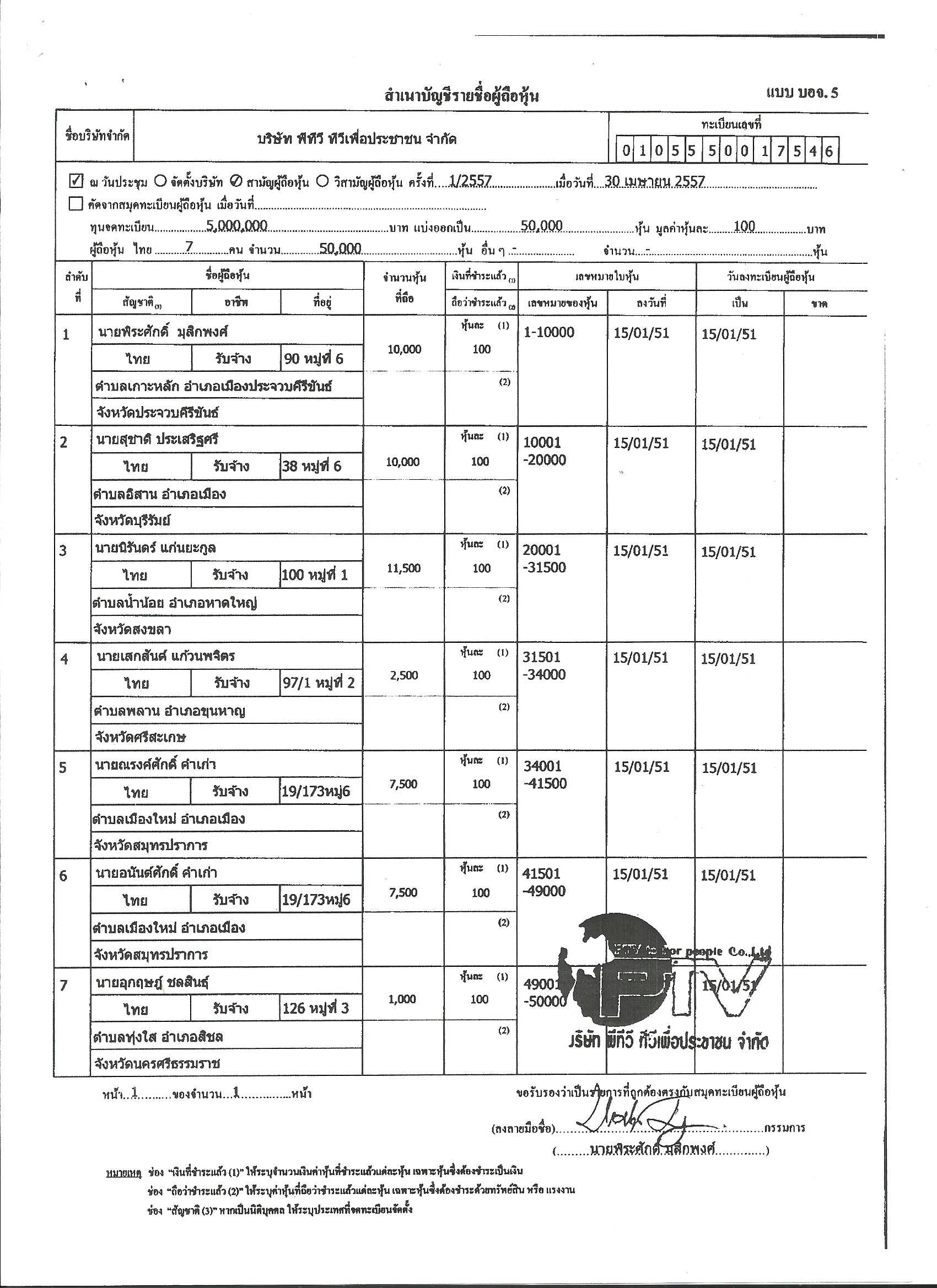 รายชื่อผู้ถือหุ้น บริษัท พีซ เทเลวิชั่น จำกัด (ชื่อเดิม บริษัท รวยทันที จำกัด)