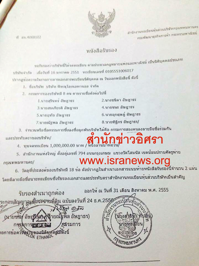 ขณะที่ในสัญญาซื้อขายที่ดินระหว่าง นายศุภชัย ศรีศุภอักษร กับ บริษัท พิษณุโลกเอทานอล จำกัด ที่ทำขึ้นที่บริษัท พิษณุโลกเอทานอล จำกัด เมื่อวันที่ 24 ธ.ค.2556 ระบุว่าตัวแทนจากบริษัทฯ ที่ลงชื่อในสัญญา คือ นายชนะ อัษฎาธร และนายณัฐพล อัษฎาธร ในฐานะที่ยังมีตำแหน่งเป็นกรรมการบริษัทฯ