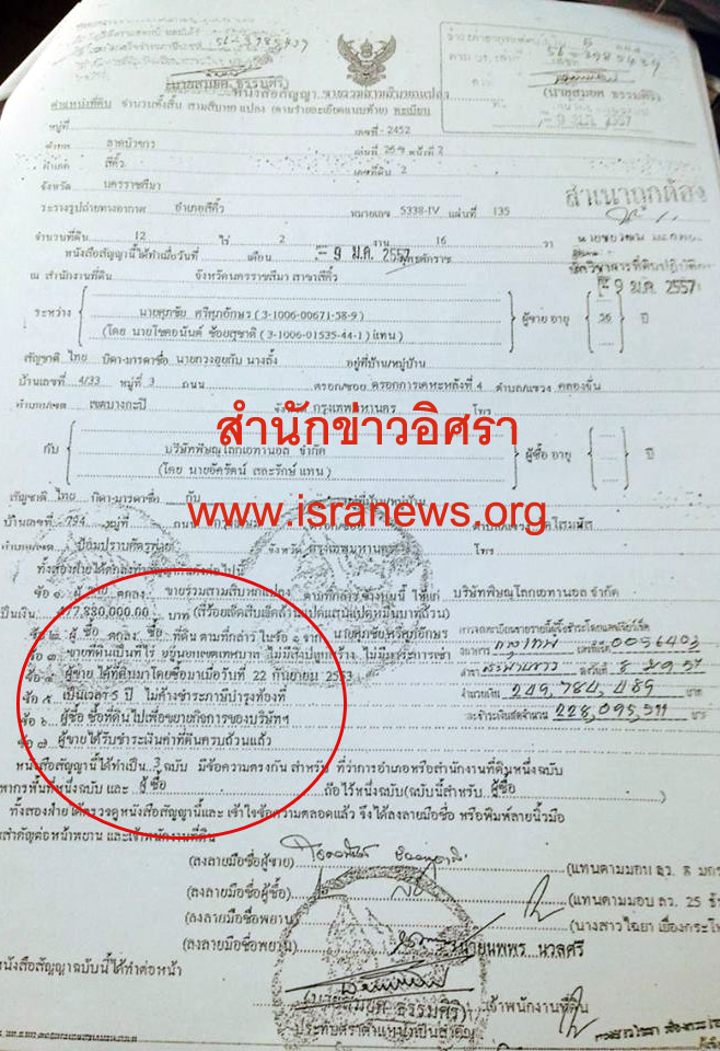 จากการตรวจสอบหนังสือสัญญาซื้อที่ดินที่ทำขึ้นที่ สำนักงานที่ดิน จังหวัดนครราชสีมา สาขาสีคิ้ว เมื่อวันที่ 9 ม.ค.2557 ระบุว่า ข้อตกลงทั้ง 2 ฝ่ายว่า เป็นการขายที่ดินรวมสามสิบหกแปลง ในราคา 477,880,000 บาท โดยเป็นที่ดินที่อยู่นอกเขตเทศบาล ไม่มีสิ่งปลูกสร้าง ไม่มีภาระการเช่า นายศุภชัย ได้ที่ดินมาโดยการซื้อเมื่อวันที่ 22 ก.ย.2553 ไม่ค้างชำระภาษีบำรุงท้องที่ ขณะที่บริษัทฯ ซื้อที่ดินไปเพื่อขยายกิจการของบริษัทฯ (ดูเอกสารประกอบ)