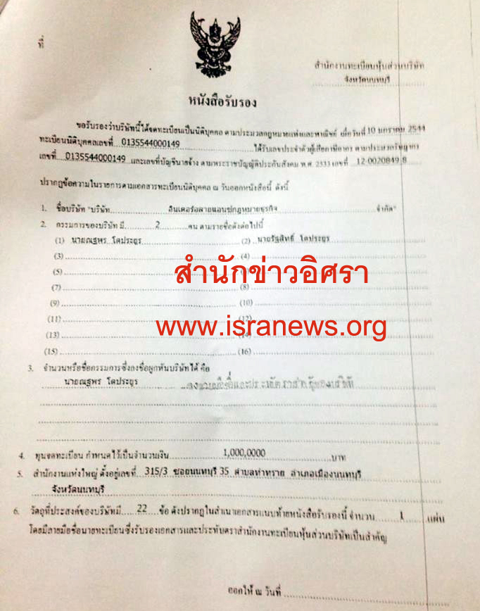 ข้อมูลจากกรมพัฒนาธุรกิจการค้า ระบุว่า บริษัท อินเตอร์อลายแอนซ์กฏหมายธุรกิจ จำกัด จดทะเบียน 10 มกราคม 2544 ทุนปัจจุบัน 1 ล้านบาท ตั้งอยู่เลขที่ 315/3 ซอยนนทบุรี 35 ถนนสนามบินน้ำ ตำบลท่าทราย อำเภอเมืองนนทบุรี จังหวัดนนทบุรี