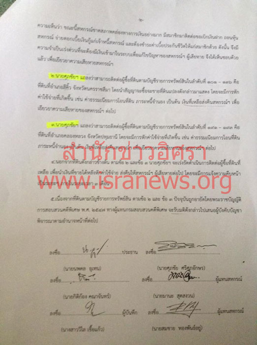 นอกจากนี้แล้ว นายศุภชัย จะเร่งดำเนินการติดต่อผู้ซื้อที่ดินที่เหลือ เพื่อนำเงินที่ขายได้หลังหักค่าใช้จ่าย ส่งคืนให้สหกรณ์ฯ โดยจะมีการแจ้งความคืบหน้าเป็นระยะ ๆ ภายในระยะเวลา 3 เดือน (ดูเอกสารประกอบ)