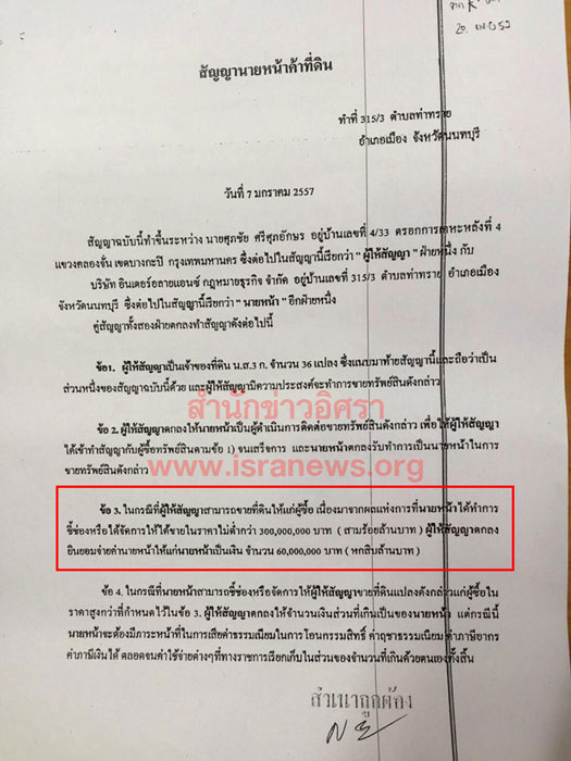หนึ่ง ในสัญญาดังกล่าวมีการระบุว่า กรณีผู้ให้สัญญาสามารถขายที่ดินให้แก่ผู้ซื้อ เนื่องจากผลแห่งการที่นายหน้าได้ทำการชี้ช่องหรือได้จัดการให้ได้ขายในราคาไม่ต่ำกว่า 300 ล้านบาท ผู้ให้สัญญาตกลงยินยอมจ่ายค่านายหน้าให้แก่นายหน้าเป็นเงิน 60 ล้านบาท
