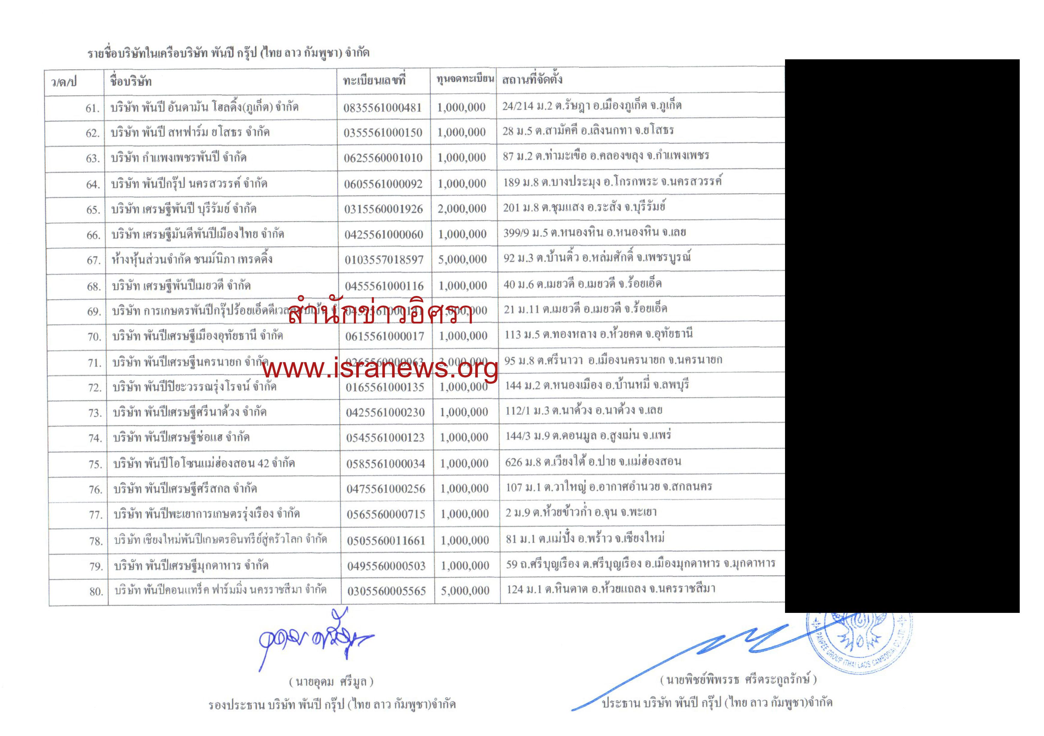 สำหรับข้อมูลเกี่ยวกับบริษัทเอกชน ในเครือข่ายนั้น พบว่ามีการจดทะเบียนจัดตั้งในหลายจังหวัดทั่วประเทศรวมจำนวนกว่า 153 แห่ง เกือบทั้งหมดมักจะใช้คำว่า พันปี มาเป็นคำหลักในการตั้งชื่อบริษัท (ดูเอกสารประกอบ)