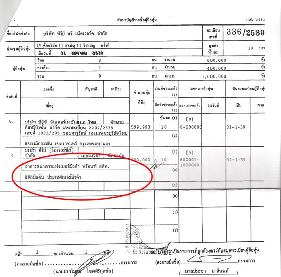 กรณีสำนักข่าวอิศรา (www.isranews.org) ตรวจสอบพบว่า บริษัท ทีวีบี ทรี เน็ตเวอร์ค จำกัด ในเครือบีอีซีเวิลด์ (เจ้าของช่อง 3 )ซึ่งจัดตั้งโดย นายประชา มาลีนนท์ ด้วยทุน 10 ล้านบาท เมื่อวันที่ 31 มกราค 2539 เป็นการร่วมหุ้นระหว่างบริษัท บีอีซี อินเตอร์เนชั่นแนล ดิสทริบิวชั่น จำกัด สัญชาติไทย ถือหุ้น 60% และบริษัท ทีวีบี(โอเวอร์ซีส์) จำกัด ถือหุ้น 40% ซึ่งบริษัท ทีวีบี(โอเวอร์ซีส์) จำกัด แจ้งที่อยู่ เซด้าร์เฮ้าส์ 41 เซดาร์ อเวนิว แฮลมินตัน เอชเอ็ม 12 ประเทศเบอร์มิวด้า