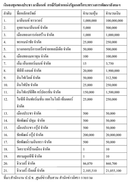 ในจำนวนนี้เป็น “เงินลงทุน”ประเภทหลักทรัพย์และเงินลงทุนอื่น 21 แห่ง รวมทั้งสิ้น 148,682,070.00 บาท แต่ไม่พบเงินลงทุนบริษัท ทีวีบี(โอเวอร์ซีส์) จำกัด ในรายการทรัพย์สินของนายประชาและนางแพตตรีเซียแมรี่ ภรรยา แต่อย่างใด (ดูตาราง)