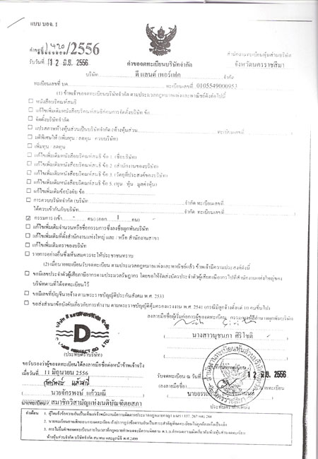 การโอนหุ้นดังกล่าว เมื่อวันที่ 12 มิถุนายน 2556 บริษัท ดีแลนด์ เพอร์เฟค จำกัด โดยนางสาวนุชนภา ศิริโชติ ได้ส่งสำเนาบัญชีรายชื่อผู้ถือหุ้น (บอจ.5) ต่อนายทะเบียนหุ้นส่วนบริษัทจังหวัดนครราชสีมา ระบุ นางสาวนุชนภา ถือหุ้นทั้งหมด 49,998 หุ้น นางสาวลำมูล จาจันทึก และ นายประสงค์ จาจันทึก คนละ 1 หุ้น รวม 50,000 หุ้น