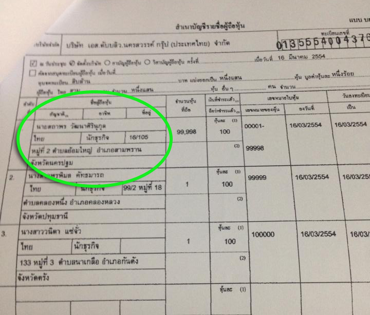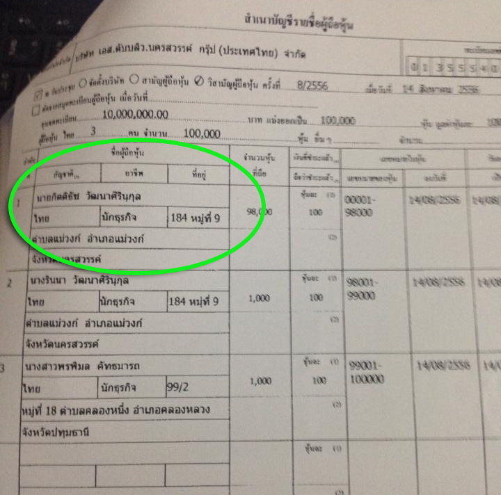 ส่วนเงินสด ที่นำมาใช้ในการจดทะเบียนตั้งบริษัท ก็เป็นของนายสถาพร จำนวน 9,999,800 บาท (นางรินนา ผู้เป็นแม่ร่วมถือหุ้นอยู่ด้วยจำนวน 1 หุ้น มูลค่า 100 บาท)