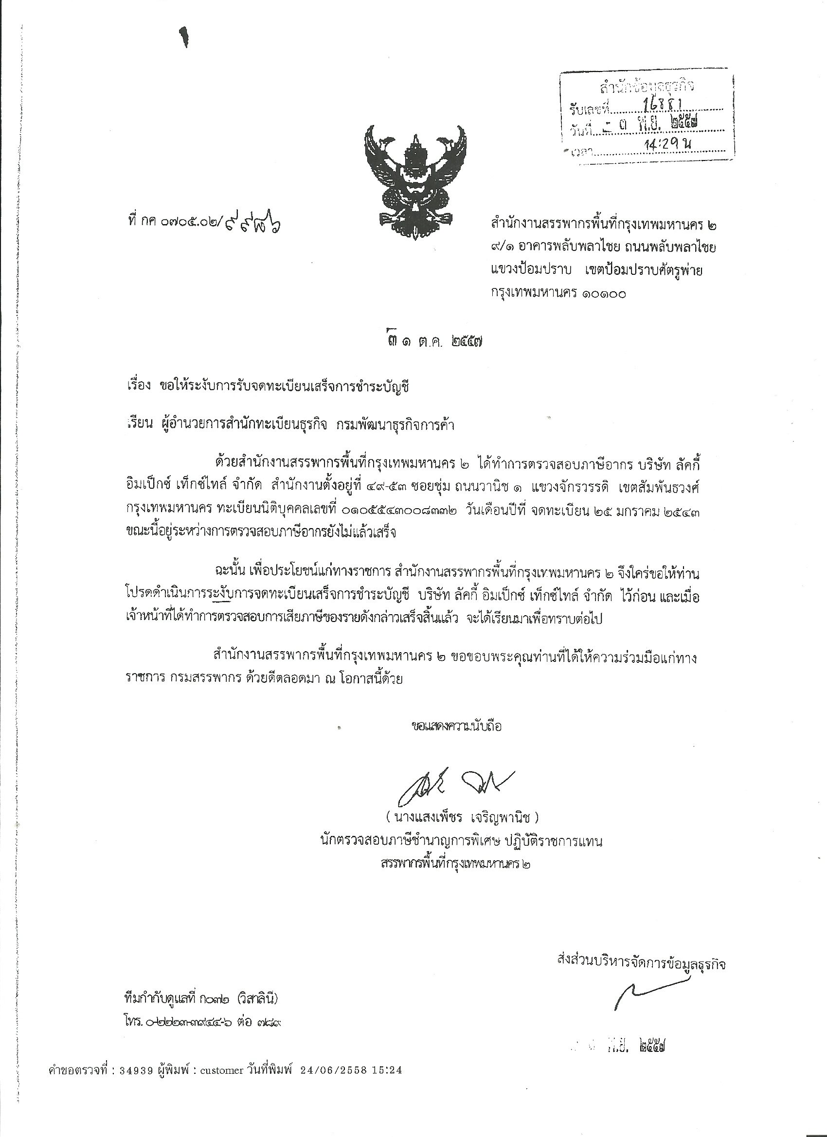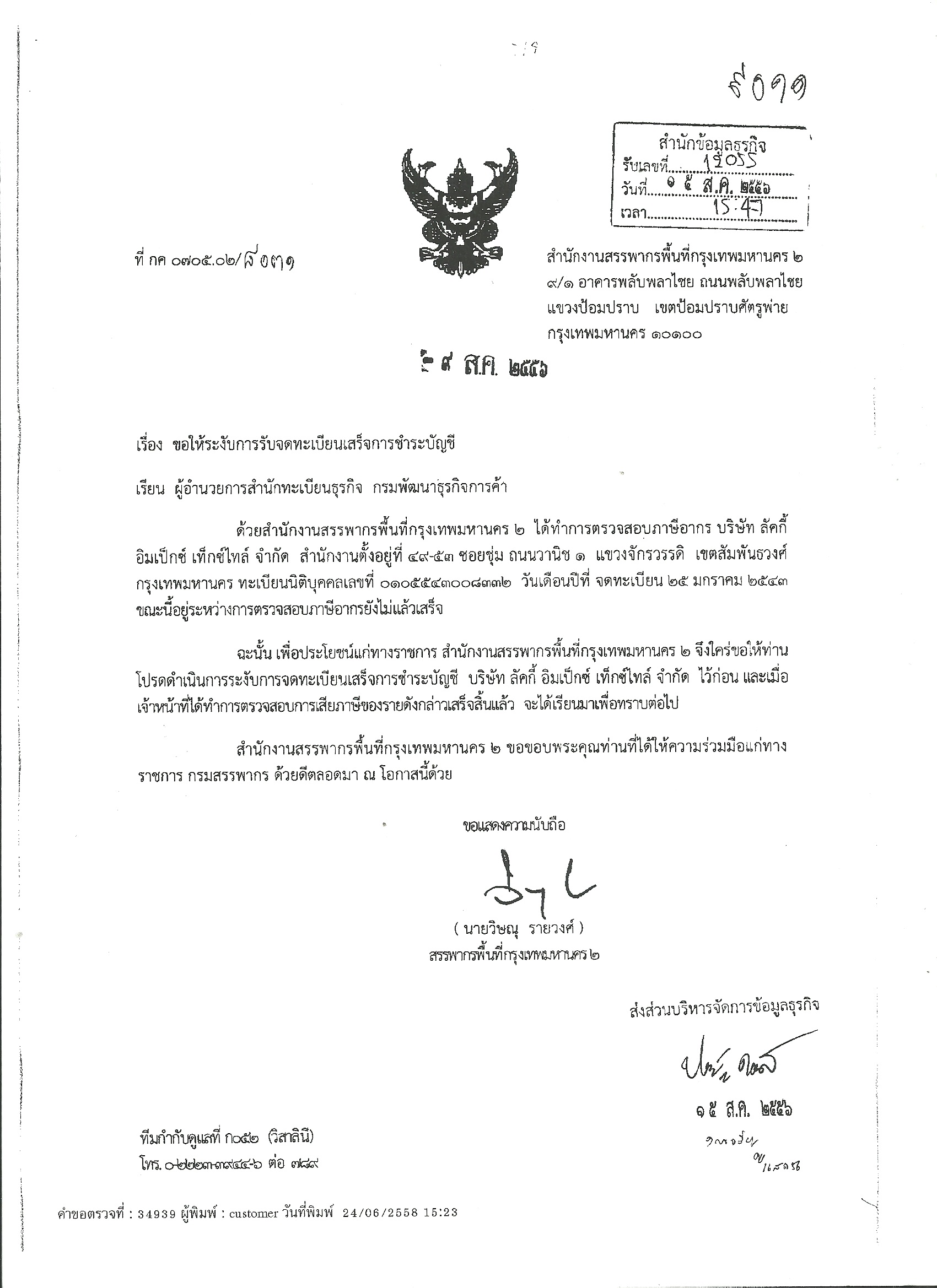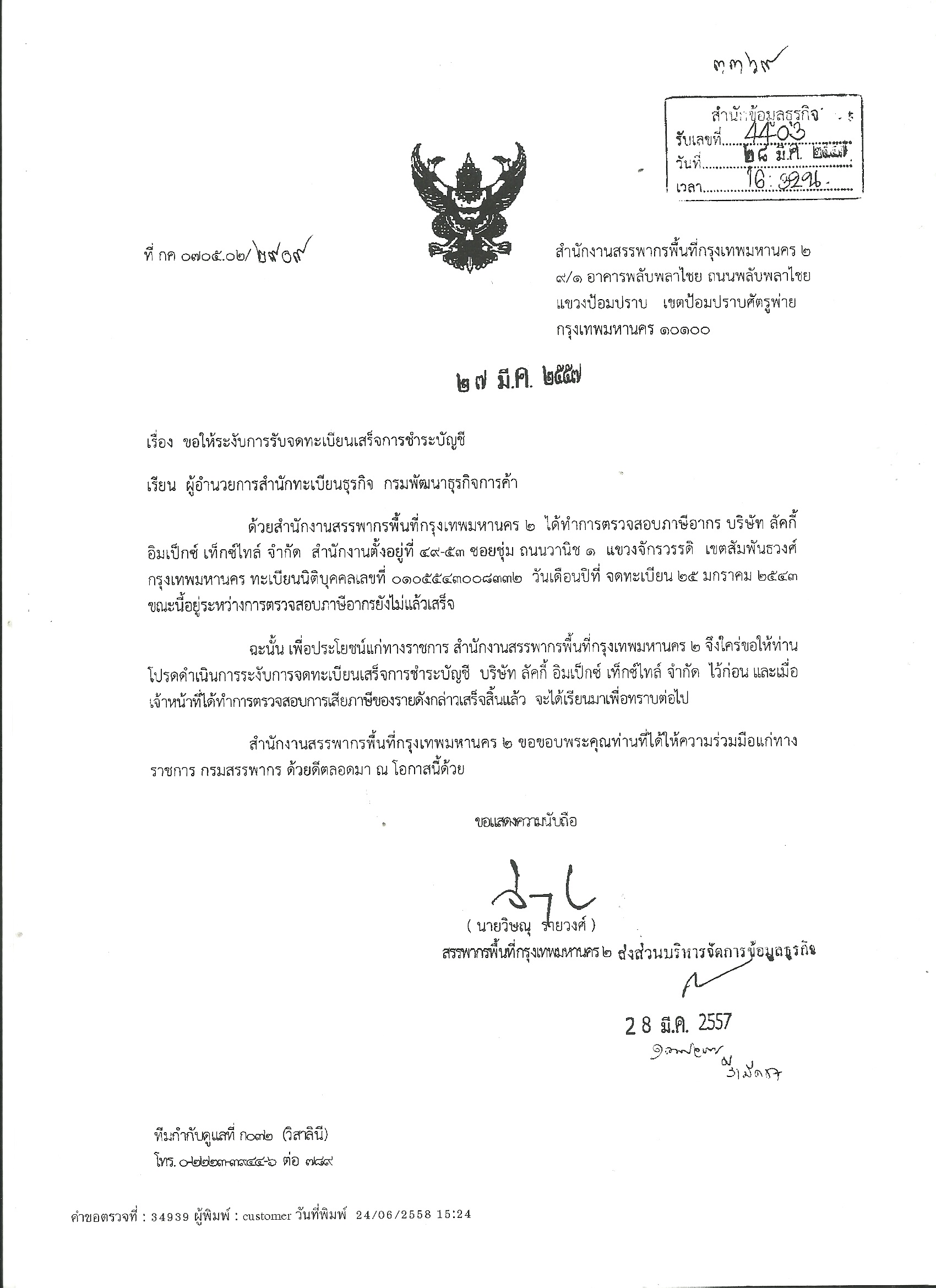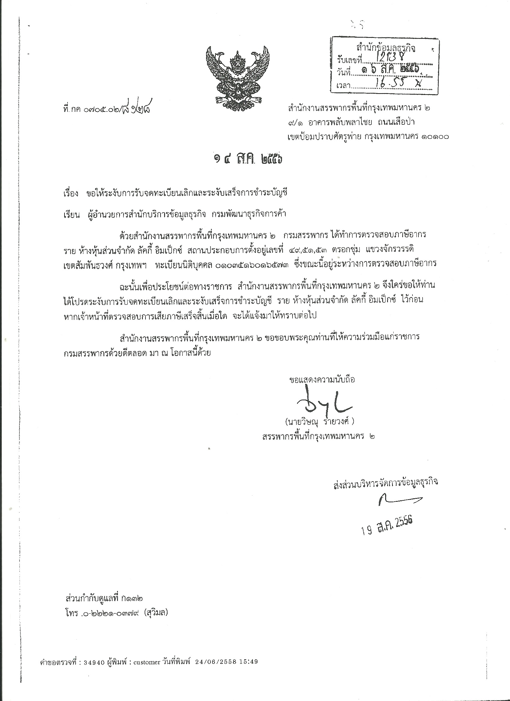 ส่วนหนังสือที่สรรพากรพื้นที่กรุงเทพมหานคร 2 ส่งถึงผู้อำนวยการสำนักทะเบียนธุรกิจ กรณีห้างหุ้นส่วนจำกัด (หจก.) ลัคกี้ อิมเป็กซ์ นั้น ลงวันที่ 14 ส.ค.56 โดยนายวิษณุ รายวงศ์ สรรพากรพื้นที่กรุงเทพมหานคร 2 (ดูเอกสารประกอบ)