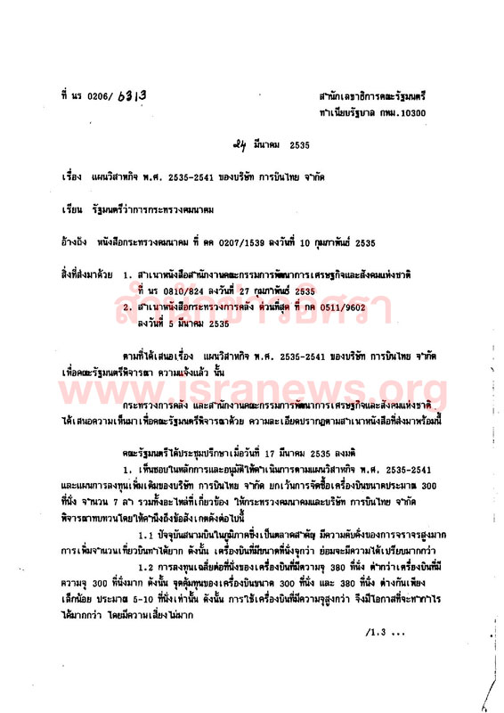 มติคณะรัฐมนตรีวันดังกล่าว เห็นชอบในหลักการและอนุมัติให้ดำเนินการตามแผนวิสาหกิจ พ.ศ.2535-2541 และแผนการลงทุนเพิ่มเติมของบริษัท การบินไทยฯ ยกเว้นการจัดซื้อเครื่องบินขนาด 300 ที่นั่ง จำนวน 7 ลำ รวมถึงอะไหล่ที่เกี่ยวข้อง โดยมีข้อสังเกต ดังนี้
