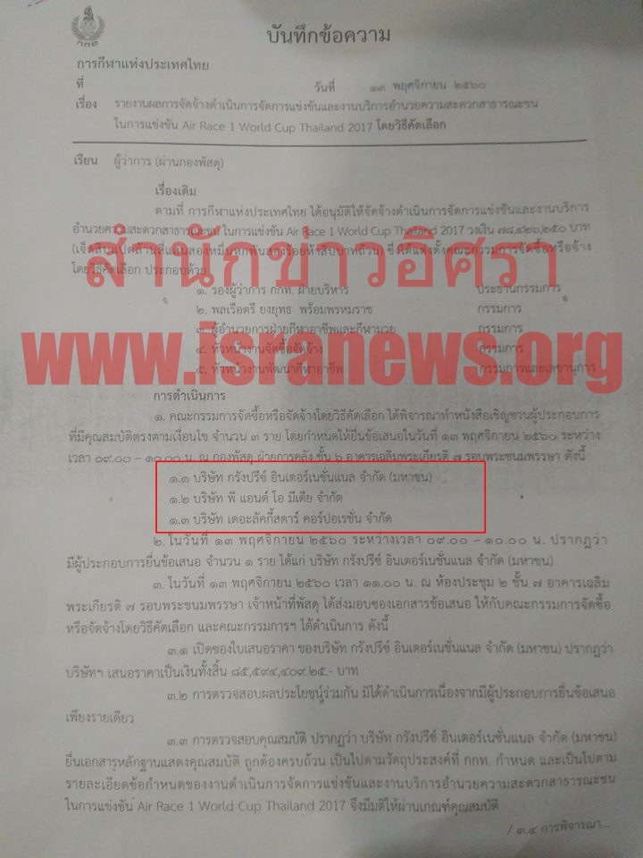 ล่าสุดสำนักข่าวอิศรา ได้ตรวจสอบข้อมูลเพิ่มเติมพบว่า ในเอกสารรายงานผลการจัดจ้างดำเนินการจัดการแข่งขันและงานบริการอำนวยความสะดวกสาธารณชน ในการจัดกิจกรรม Air Race 1 ของ กกท. ลงวันที่ 13 พ.ย. 2560 มีการระบุข้อมูลรายละเอียดขั้นตอนการจัดซื้อจัดจ้างโดยวิธีการคัดเลือกว่า คณะกรรมการการจัดจ้างฯ ได้ส่งหนังสือเชิญชวนผู้ประกอบการที่มีคุณสมบัติตรงตามเงื่อนไขจำนวน 3 เข้าร่วมการเสนอราคา ได้แก่ 1.บริษัท กรังปรีซ์ อินเตอร์เนชั่นแนล จำกัด (มหาชน) 2.บริษัท พี แอนด์ โอ มีเดีย จำกัด และ 3.บริษัท เดอะลัคกี้สตาร์ คอร์ปอเรชั่น จำกัด