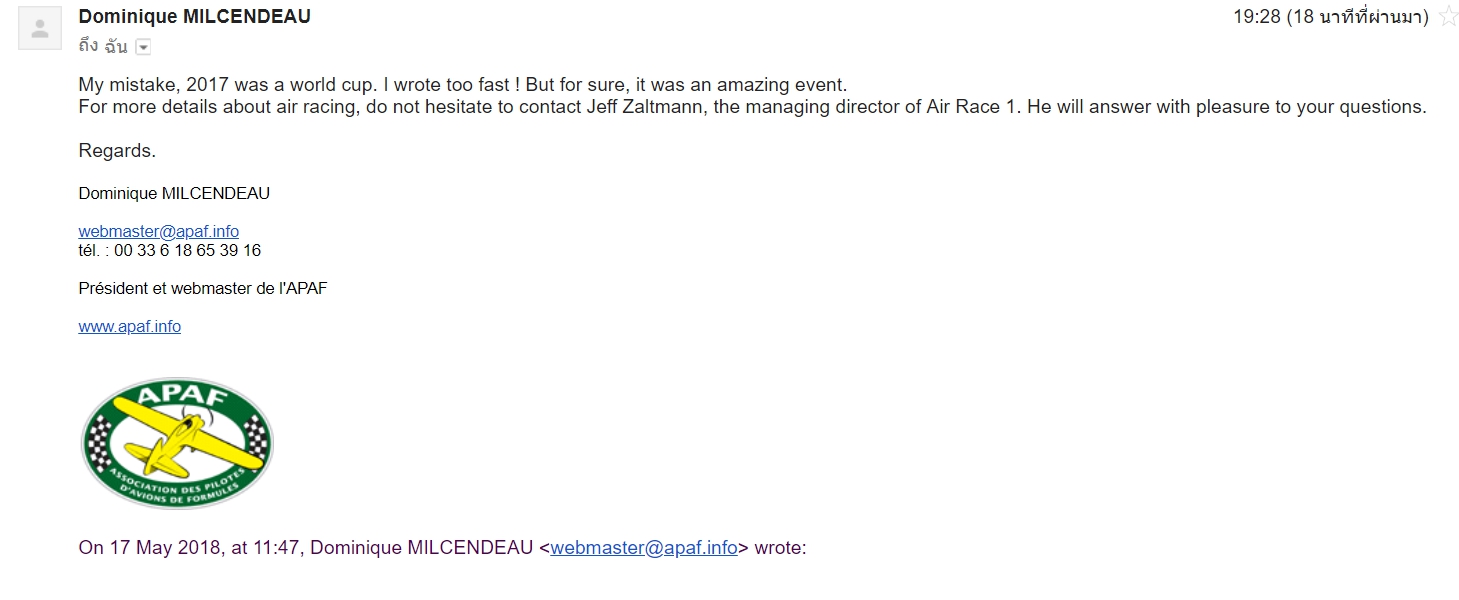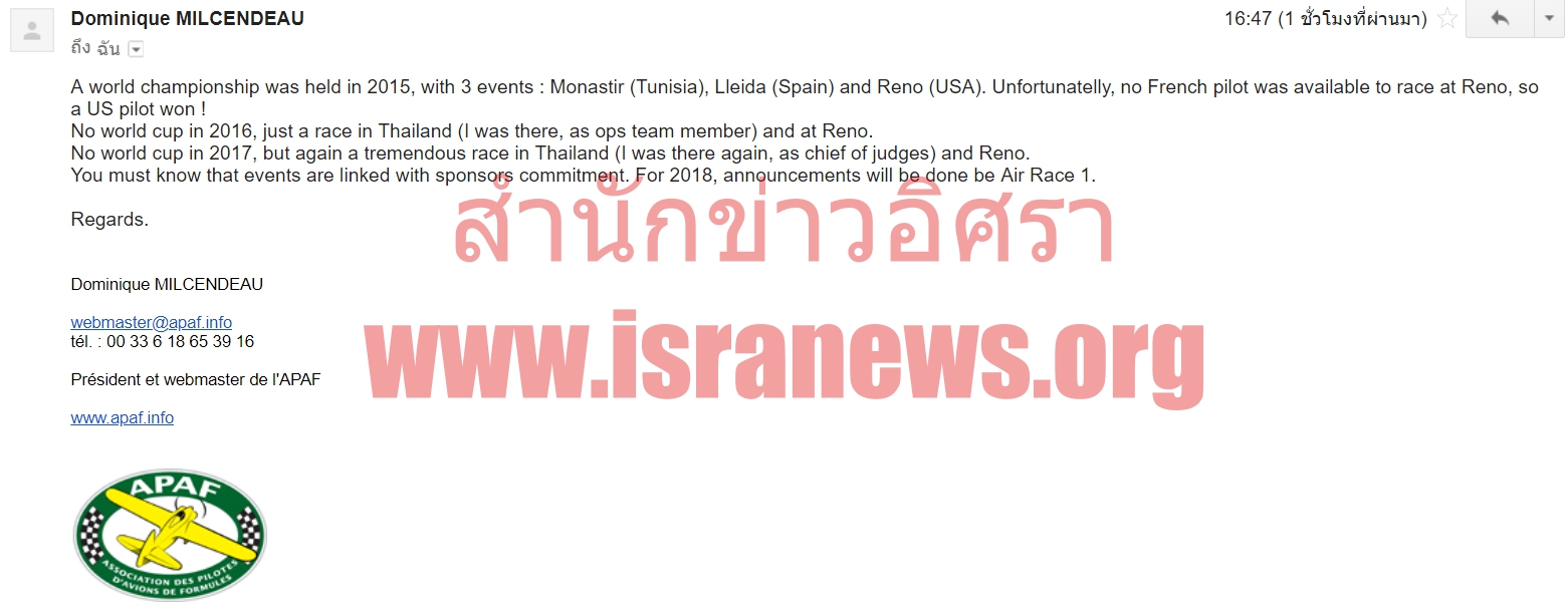 เมื่อสำนักข่าวอิศราได้สอบถามเพิ่มเติมกับทาง APAF ว่าเคยมีการแข่งขัน Air Race 1 World Series เกิดขึ้นจริงหรือไม่ นาย Dominique กล่าวว่าเคยมีการจัดการแข่งขันชิงแชมป์โลกเมื่อปี ค.ศ. 2015 โดยแข่งกับที่ Monistir ประเทศสเปน,Lleida ประเทศสเปน และที่รีโน่ ประเทศสหรัฐอเมริกา ซึ่งไม่มีนักบินฝรั่งเศสเข้าร่วมในการแข่งขันที่รีโน่ และปรากฎว่านักบินสหรัฐเป็นผู้ชนะ