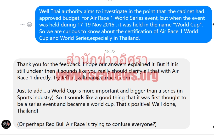 สำนักข่าวอิศราได้พยายามติดต่อไปยัง FARA เพิ่มเติมโดยแจ้งข้อมูลเกี่ยวกับปัญหาการอนุมัติขอชื่อจัดงาน Air Race 1 ในประเทศไทย และได้คำตอบยืนยันจากทาง FARA กลับมาว่างาน World Cup นั้นมีความยิ่งใหญ่กว่า Series อยู่แล้ว ถ้าหากนับตามมาตรฐานในอุตสาหกรรมการกีฬา ซึ่งนี่น่าจะเป็นเรื่องดีสำหรับประเทศไทย ที่ตอนแรกมีการเสนองาน ว่าจะจัดเป็น World Series และต่อมาถูกเปลี่ยนให้เป็น World Cup ที่มีความยิ่งใหญ่กว่า