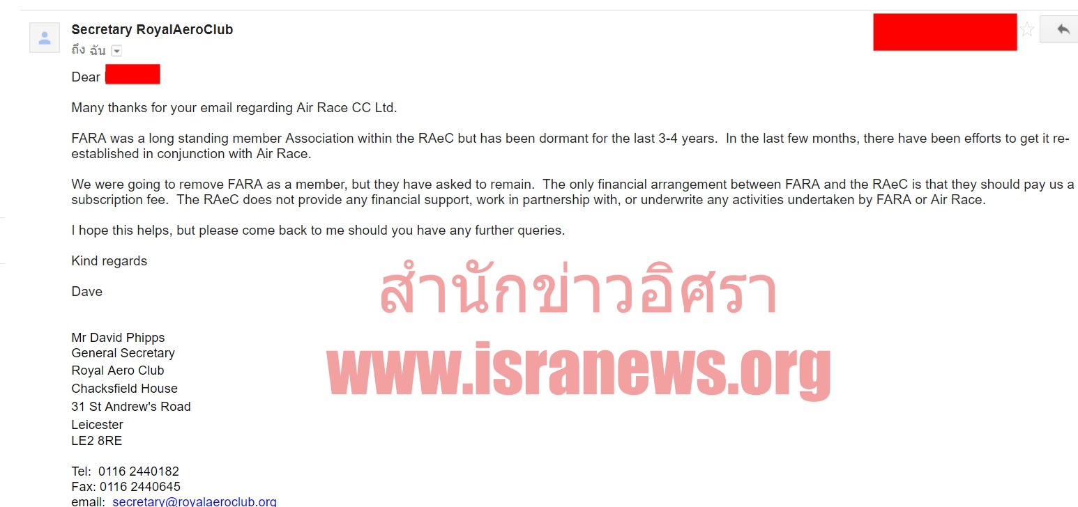 อย่างไรก็ดี สำนักข่าวอิศรา ได้อีเมล์สอบถามข้อมูลเกี่ยวกับสมาคม FARA ไปยัง Royal Aero Club ซึ่งถือว่าเป็นสมาคมกีฬาทางอากาศของประเทศอังกฤษอย่างเป็นทางการ โดยถามเกี่ยวกับสถานะความเป็นสมาชิกของ FARA และสอบถามเรื่อง Air Race 1