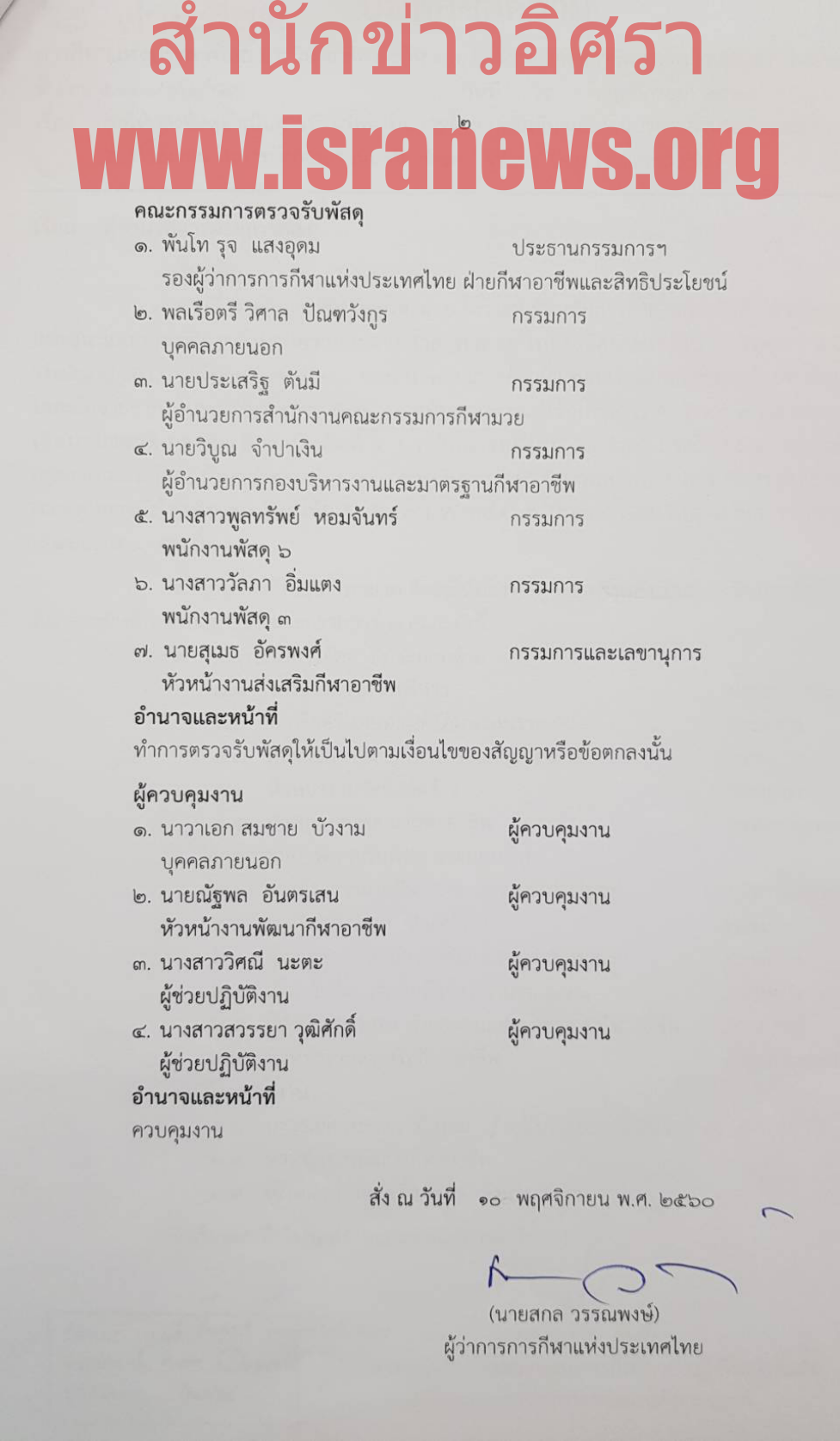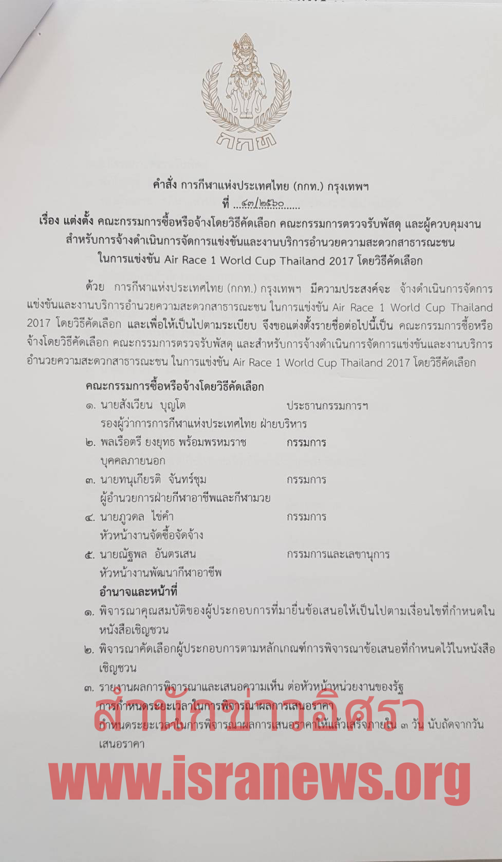 ทั้งนี้ สำนักข่าวอิศรา ได้ตรวจสอบเอกสารหลักฐานที่เกี่ยวข้องกับการจัดซื้อจัดจ้างของ กกท.เพิ่มเติม พบว่าในวันที่ 10 พ.ย. 2560 กกท.ได้มีการประชุมเพื่อตั้งคณะกรรมการซื้อหรือจ้างโดยวิธีคัดเลือก คณะกรรมการตรวจรับพัสดุ และผู้ควบคุมงานสำหรับการจ้างดำเนินการจัดการแข่งขันและงานบริการอำนวยความสะดวกสาธารณชน ในการแข่งขัน Air Race 1 World Cup Thailand 2017