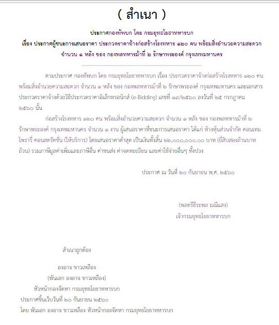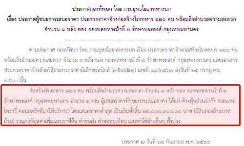 - เจาะสัญญาสุดท้ายสร้างโรงทหาร 22ล. หจก.ลูกพล.อ.ปรีชา เสนองานต่ำกว่าราคากลาง 4 ล.