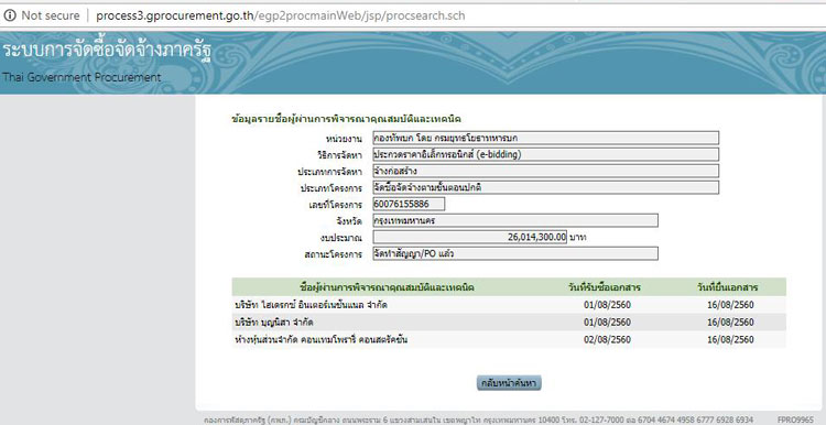 "...ในเว็บไซต์ของกรมบัญชีกลาง ไม่ได้เปิดเผยข้อมูลเป็นทางการ โดยตั้งเป็นรหัสให้เข้าไปดูรายละเอียด แต่เมื่อกรอกรหัสไปแล้ว ก็ไม่สามารถดูข้อมูลอะไรได้ ทั้งที่ กระบวนการประกวดราคางานโครงการนี้ เสร็จสิ้นไปแล้ว และมีการลงนามในสัญญาว่าจ้างเป็นทางการเมื่อวันที่ 27 ก.ย. 60 ที่ผ่านมา (เหมือนอีก 3 โครงการก่อนหน้านี้) ปรากฏเพียงแค่ผลการประกวดราคา ที่ หจก. คอนเทมโพรารี่ คอนสตรัคชั่น เสนอราคางานต่ำสุดอยู่ที่วงเงิน 22,000,000 บาท จากราคากลาง 26,014,300 บาท ได้รับงานไป ต่ำกว่าราคากลาง 4,014,300 บาท..."