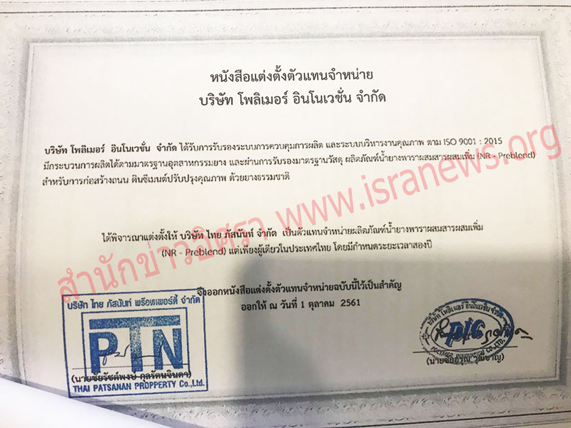 บริษัท โพลิเมอร์ อินโนเวชั่น จำกัด แต่งตั้ง บริษัท ไทย ภัสนันท์ พร๊อพเพอร์ตี้ จำกัด เป็นตัวแทนจำหน่ายเพียงผู้เดียวในประเทศไทย เป็นระยะเวลา 2 ปี นับตั้งแต่วันที่ 1 ต.ค.2561