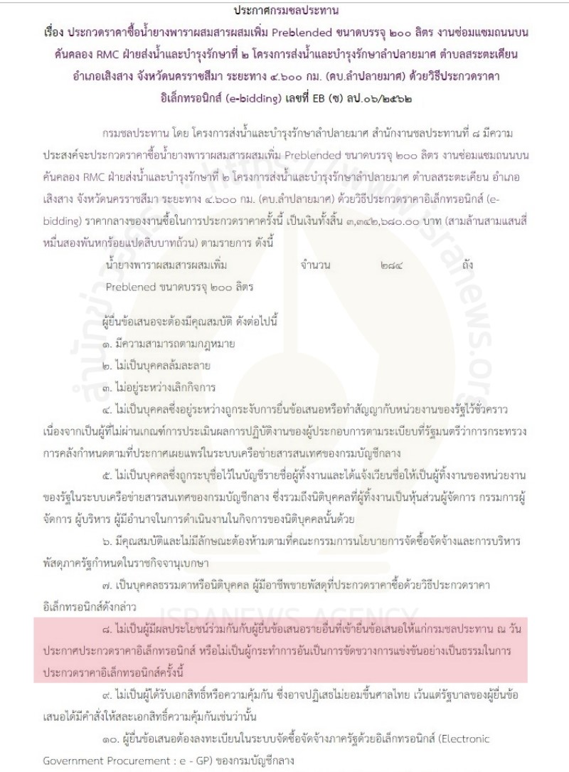 - ประกาศกรมชลฯ หราห้ามมีผลปย.ร่วมกัน! หลักฐานมัด บ.ตัวแทนแข่ง e-bidding ขายสารผสมถนนยางฯ