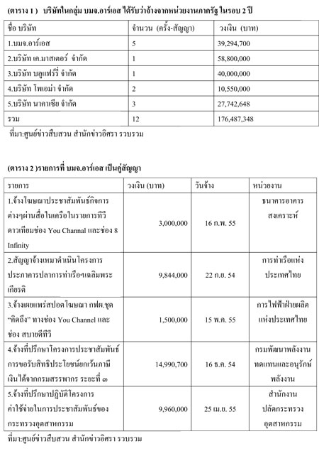 สำนักข่าวอิศรา www.isranews.org ตรวจสอบพบว่า นับจากเดือนสิงหาคม 2554 เป็นต้นมาจึงสิ้นปี 2555 บริษัทในกลุ่ม บมจ.อาร์เอส 5 บริษัทได้รับว่าจ้างจากหน่วยงานภาครัฐให้ทำประชาสัมพันธ์และจัดกิจกรรม อย่างน้อย 12 ครั้ง รวมวงเงิน 176,487,348 บาท ได้แก่