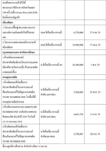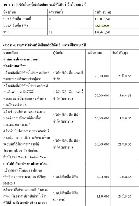 ขณะที่ บริษัท จีเอ็มเอ็ม มีเดีย จำกัด (มหาชน) และ บริษัท จีเอ็มเอ็ม แกรมมี่ จำกัด (มหาชน) ในปี 2555 ได้รับว่าจ้างจากหน่วยงานภาครัฐในการทำประชาสัมพันธ์และจัดงานกิจกรรมทั้งสิ้น 12 ครั้ง วงเงินรวม 156,441,541 บาท หน่วยงานหลัก สำนักงานปลัดกระทรวงการท่องเที่ยวและกีฬา การไฟฟ้าฝ่ายผลิตแห่งประเทศไทย เมืองพัทยา และกรมสุขภาพจิต กระทรวงสาธารณสุข (ดูตาราง 3-4)