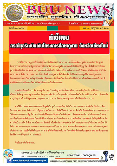 ผู้สื่อข่าว สำนักข่าวอิศรา www.isranews.org รายงานว่า เมื่อเวลา 15.00 น. วันที่ 12 กรกฎาคม 2556 ที่ผ่านมา แฟนเพจ "Public Relations of BUU" ซึ่งเป็นจุดเผยแพร่งานประชาสัมพันธ์ ของมหาวิทยาลัยบูรพา ได้โพสต์จดหมายข่าว คำชี้แจงกรณีทุจริตเบิกเงินโครงการศึกษาดูงาน จังหวัดเชียงใหม่