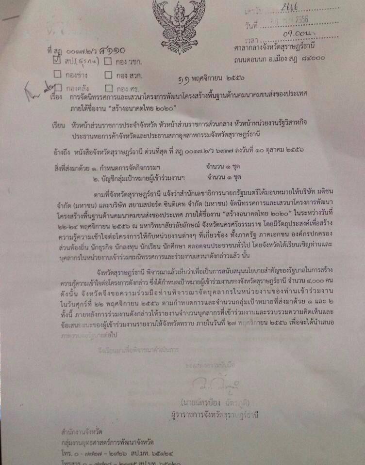 - เผยโฉมหนังสือผู้ว่าฯสุราษฎร์ฯ เกณฑ์คนร่วมงานอีเวนต์กม.เงินกู้2ล้านล.