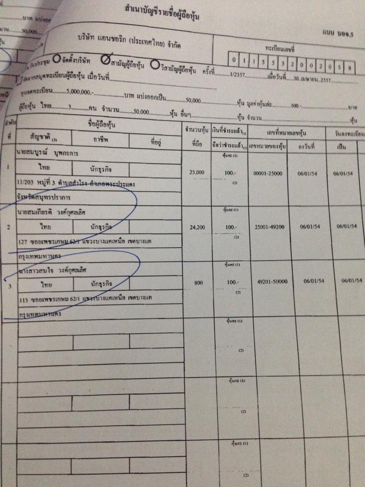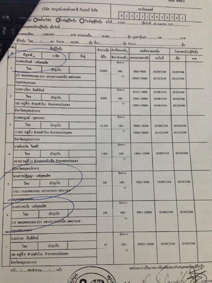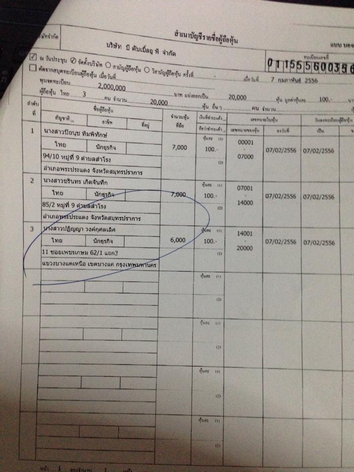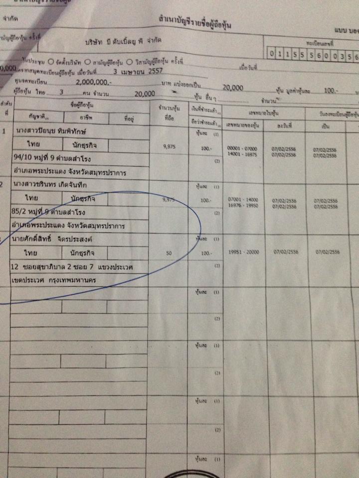 แต่จำนวนหุ้นปรับลดลงเหลือเพียงแค่ 50 หุ้น ส่วนหุ้นที่เหลือถูกแบ่งไปอยู่ที่ น.ส.ปิยนุช ทิมพิทักษ์ และน.ส.ชรินทร เกิดจันทึก ซึ่งถือไว้จำนวนเท่ากัน คือ 9,975 หุ้น