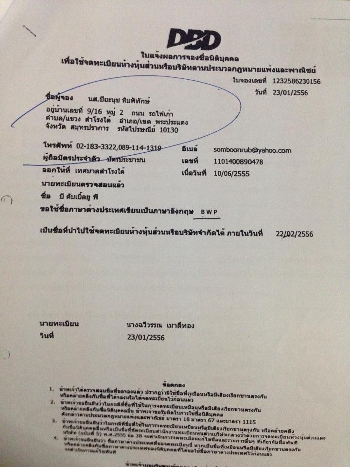 4. ในใบแจ้งผลการจองชื่อ บริษัท บี ดับเบิ้ลยู พี จำกัด เพื่อจดทะเบียนบริษัทต่อกรมพัฒนาธุรกิจการค้า กระทรวงพาณิชย์ เมื่อวันที่ 23 มกราคม 2556 น.ส.ปิยะนุช ทิมพิทักษ์ ได้ระบุที่อยู่ของตนเอง คือ บ้านเลขที่ 9/16 หมู่ 2 ถนนรถไฟเก่า ต.สำโรงใต้ อำเภอพระประแดง จ.สมุทรปราการ 10130 ซึ่งเป็นที่ตั้งบริษัท แอนชอริก (ประเทศไทย) จำกัด และบริษัท สมบูรณ์ แอนด์ เอส.พี.รับเบอร์ จำกัด