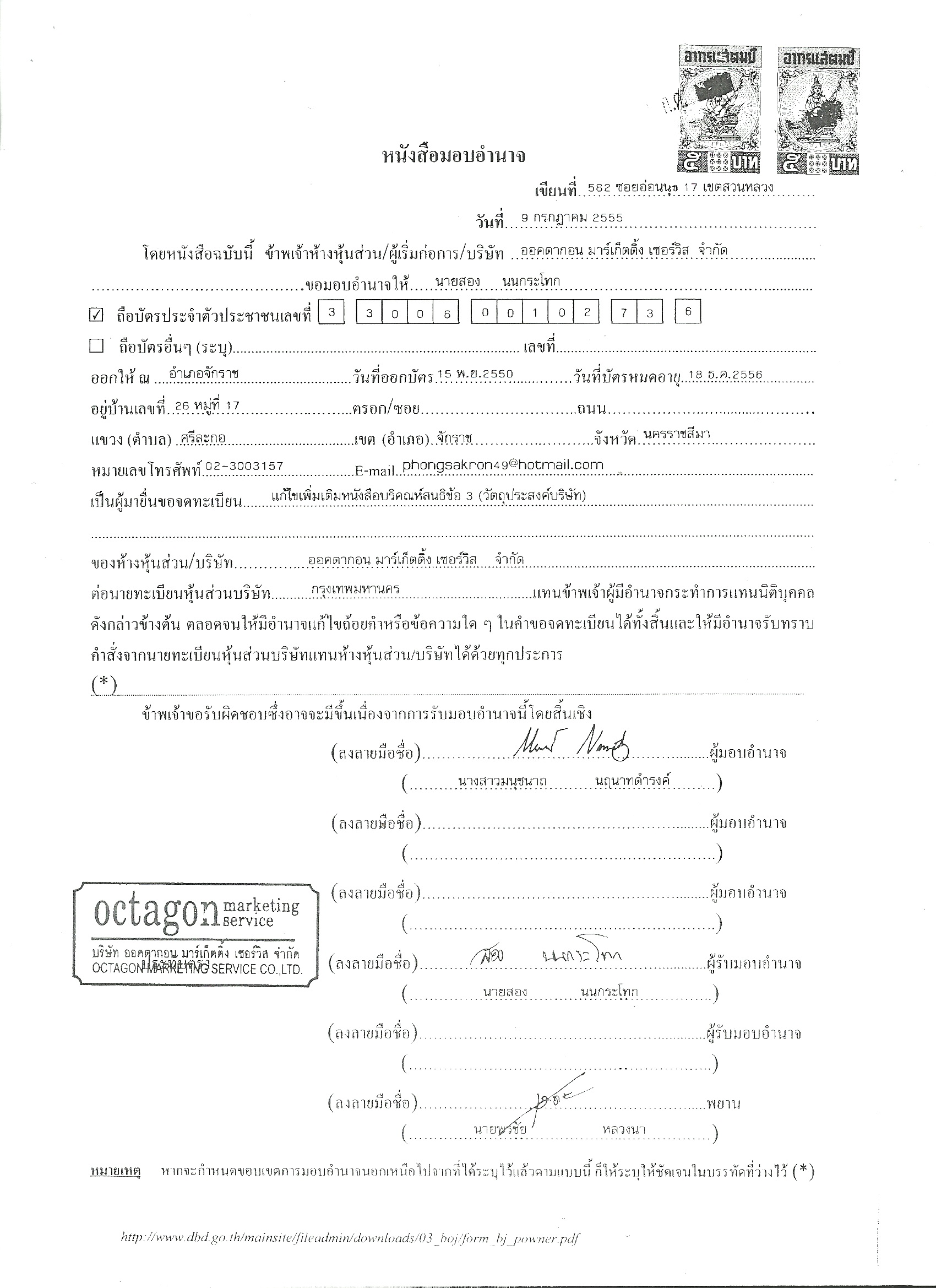ผู้รับมอบอำนาจ 9 ก.ค.55 นายสอง นนกระโทก รับมอบอำนาจจาก น.ส.สุชาดา นิพัฒน์ศิริผลกรรมการบริษัทเป็นผู้มายื่นขอจดทะเบียนแก้ไขเพิ่มเติมบริคณห์สนธิ(วัตถุประสงเพิ่มเติมของบริษัท)ต่อนายทะเบียน |