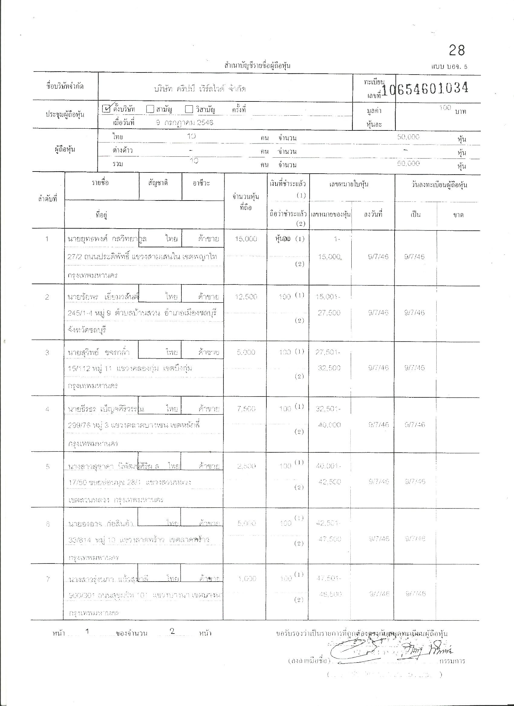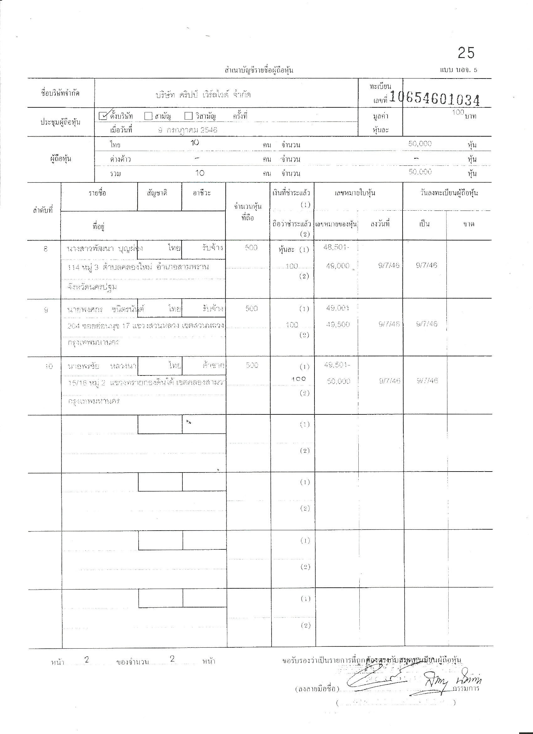 ผู้จดทะเบียน-หุ้นส่วน 1.นายยุทธพงศ์ กลวิทยากูล 2.นายชัยพร เอี่ยมวสันต์ 3.นายสุวิทย์ ขจรกล่ำ 4.นายธีระ เบ็ญจศิริวรรณ 5.น.ส.สุชาดา นิพัฒน์ศิริผล 6.นายองอาจ ก่อสินค้า 7.น.ส.รุ่งนภา แก้วสุมาลี 8.น.ส.พัฒนา บุญผ่อง 9.นายพงศกร ชนิตรนันต์ 10.นายพรชัย หลวงนา |
