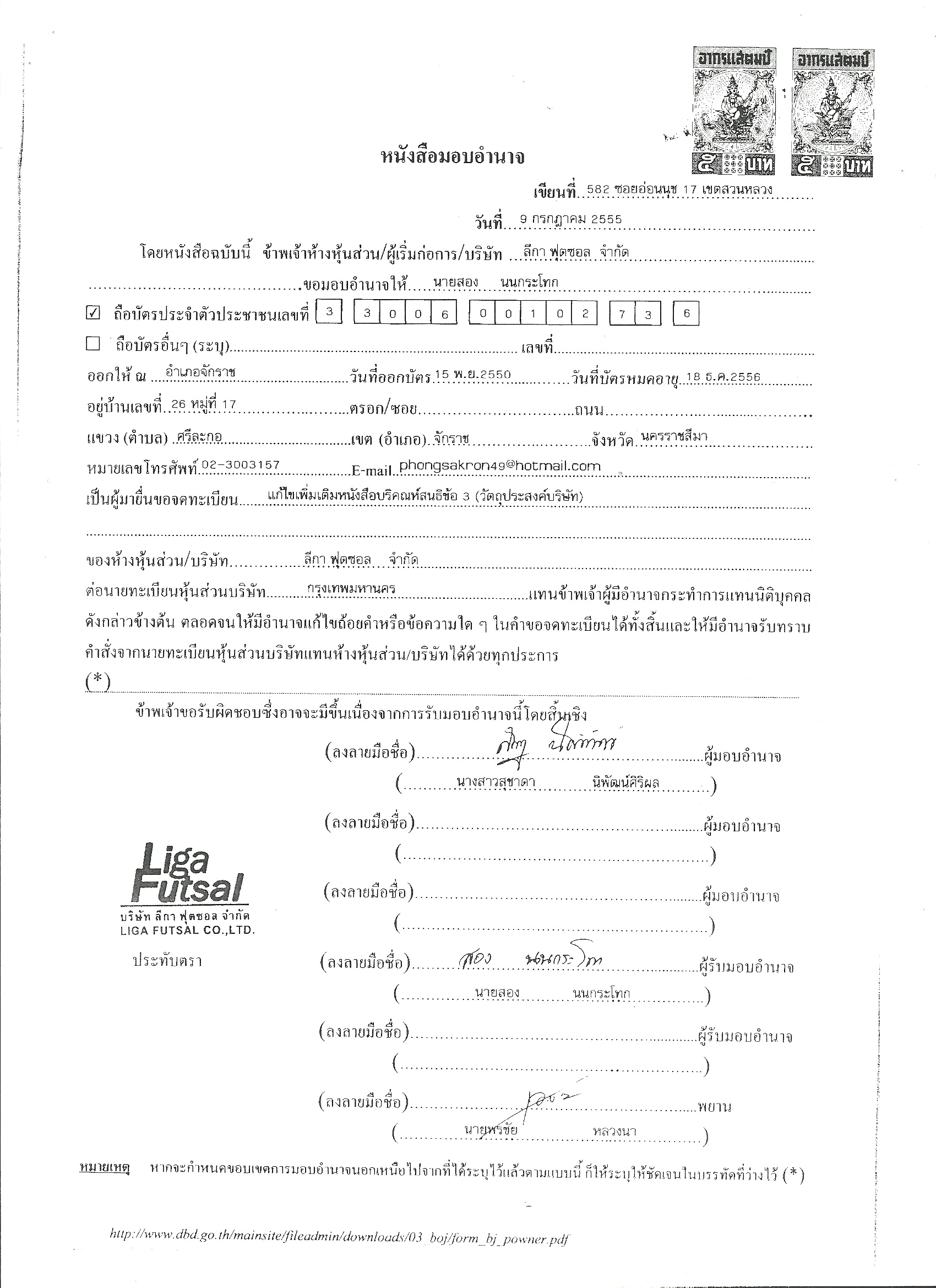 3.บริษัท ลีกา ฟุตซอล จำกัด บริษัท ออคตากอน มาร์เก็ตติ้ง เซอร์วิส จำกัด และ บริษัท อินแทรค แอนด์ โค จำกัด มีผู้รับมอบอำนาจในการยื่นจดทะเบียนเพิ่มทุน ,เปลี่ยนแปลงกรรมการ เปลี่ยนแปลงสำนักงานที่ตั้ง ต่อนายทะเบียนหุ้นส่วนบริษัทกรุงเทพมหานคร คนเดียวกันคือ นายสอง นนกระโทก (ต่อเปลี่ยนชื่อเป็น นายธนพล นนกระโทก) อยู่บ้านเลขที่ 26 หมู่ 17 ต.ศรีละกอ อ.จักราช จ.นครราชสีมา (ดูเอกสาร)