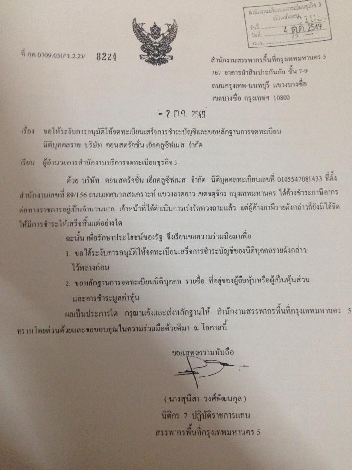 เมื่อวันที่ 2 ต.ค.2549 สำนักงานสรรพากรพื้นที่กรุงเทพมหานคร ได้ทำหนังสือถึงผู้อำนวยการสำนักงานบริหารจดทะเบียนธุรกิจ 3 โดยขอให้ระงับการอนุมัติให้จดทะเบียนเสร็จการชำระบัญชีของ บริษัท คอนสตรัคชั่น เอ็กคลูซีฟเนส จำกัด ไว้ก่อน พร้อมขอหลักฐานการจดทะเบียนนิติบุคค รายชื่อ ที่อยู่ของผู้ถือหุ้นหรือผู้เป็นหุ้นส่วนและการชำระมูลค่าหุ้น เนื่องจากตรวจสอบพบว่าบริษัทฯ แห่งนี้ ค้างชำระภาษีอากรต่อทางราชการจำนวนมาก เจ้าหน้าที่ได้ดำเนินกาเร่งรัดทวงถามแล้ว แต่ผู้ค้างภาษีรายดังกล่าวก็ยังมิได้จัดให้มีการชำระให้เสร็จสิ้นแต่อย่างใด