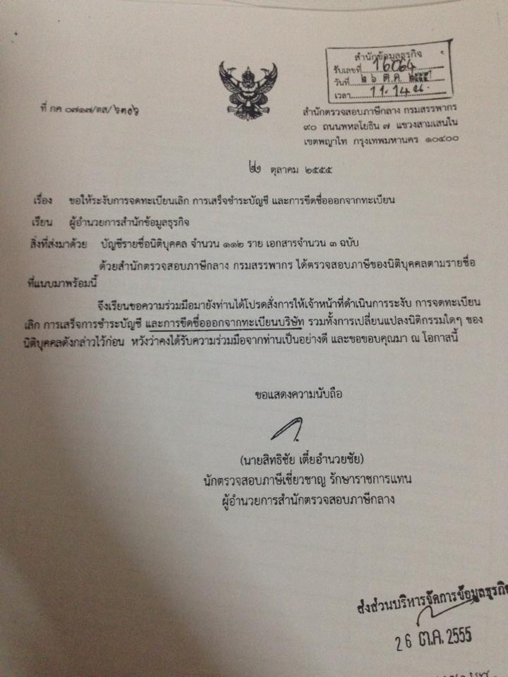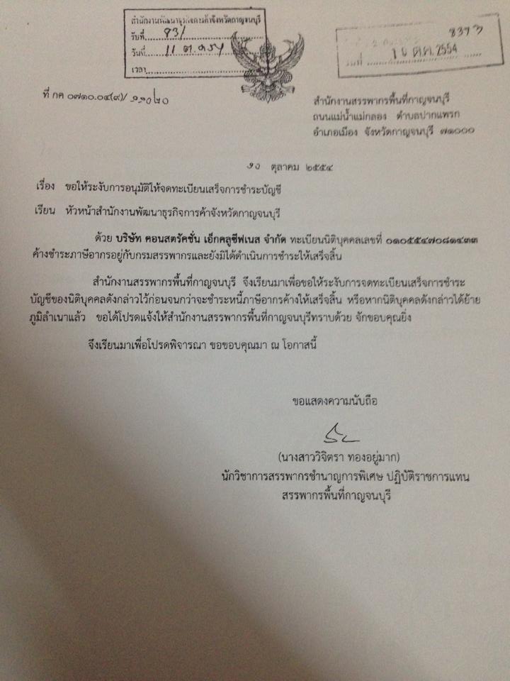 จากนั้น เมื่อวันที่ 10 ต.ค.2554 สำนักงานสรรพากรพื้นที่กาญจนบุรี ได้ทำหนังสือถึงหัวหน้าสำนักงานพัฒนาธุรกิจการค้าจ.กาญจนบุรี เพื่อแจ้งให้ขอให้ระงับการอนุมัติให้จดทะเบียนเสร็จการชำระบัญชี ของบริษัท คอนสตรัคชั่น เอ็กคลูซีฟเนส จำกัด ไว้ก่อนจนกว่าจะชำระหนี้ภาษีอากรค้างให้เสร็จสิ้น หรือหากมีการแจ้งย้ายที่อยู่ขอให้แจ้งข้อมูลให้รับทราบด้วย