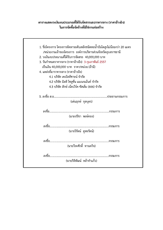 ขณะที่ เอกสาราคากลางตามที่ปรากฎในเว็บไซต์จัดซื้อจัดจ้างหน่วยงานภาครัฐของกรมบัญชีกลาง http://process3.gprocurement.go.th/egp2procmainWeb/jsp/procsearch.sch กลับระบุว่า การจัดซื้อดังกล่าว อ้างอิงราคากลางจากเอกชน 3 ราย คือ 1.บริษัท เคเบิลดีซายน์ จำกัด 2.บริษัท มัลติโซลูชั่นแมเนจเม้นท์ จำกัด และ 3.บริษัท ลักษ์ เน็ทเวิร์ค ซิสเต็ม (666) จำกัด