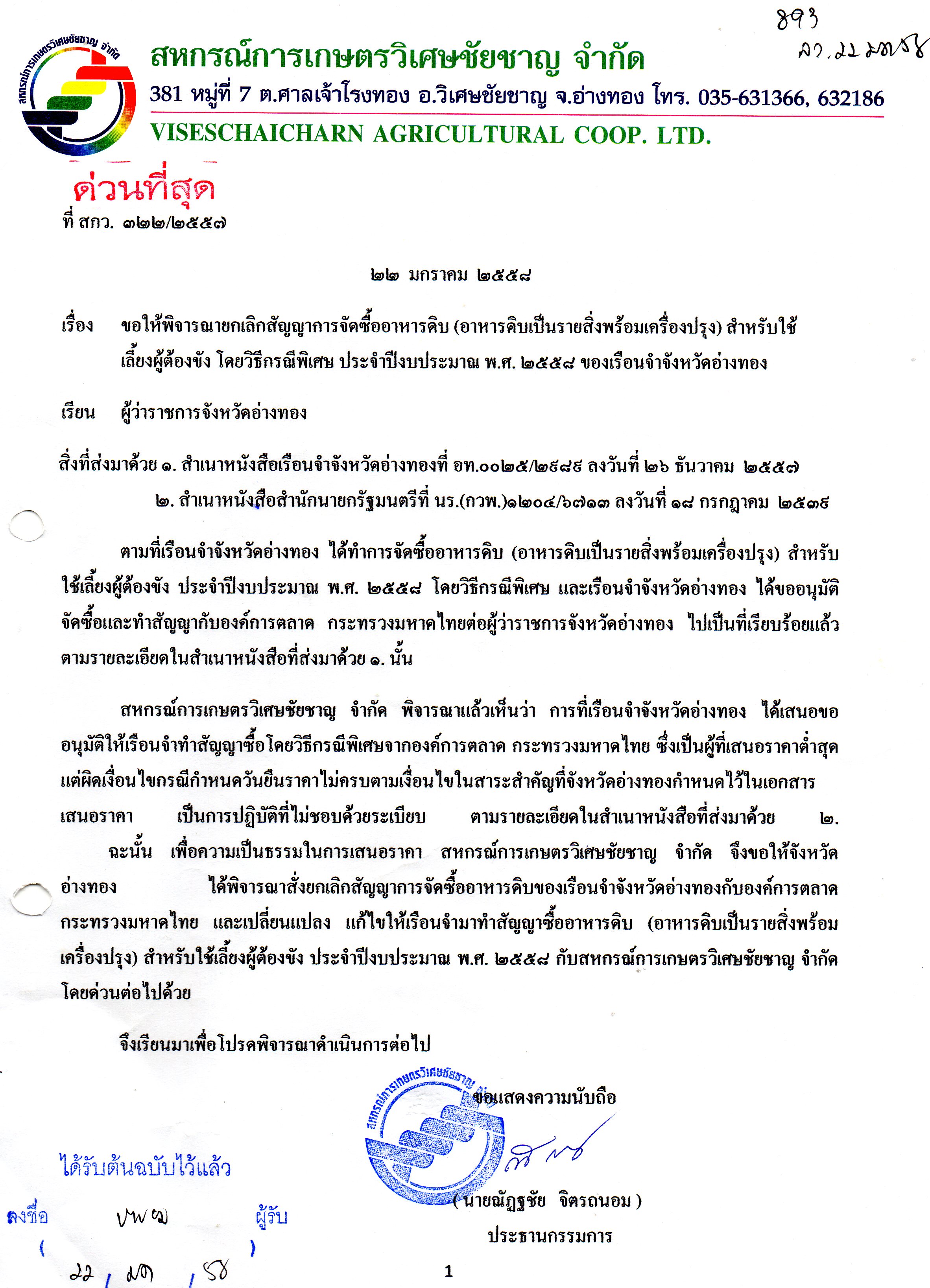 สหกรณ์ฯส่งหนังสือร้องผู้ว่าฯขอสั่งยกเลิกสัญญาจัดซื้ออาหารดิบเรือนจำอ่างทอง องค์การตลาดปีงบฯ 58 อ้างผิดเงื่อนไขสำคัญ