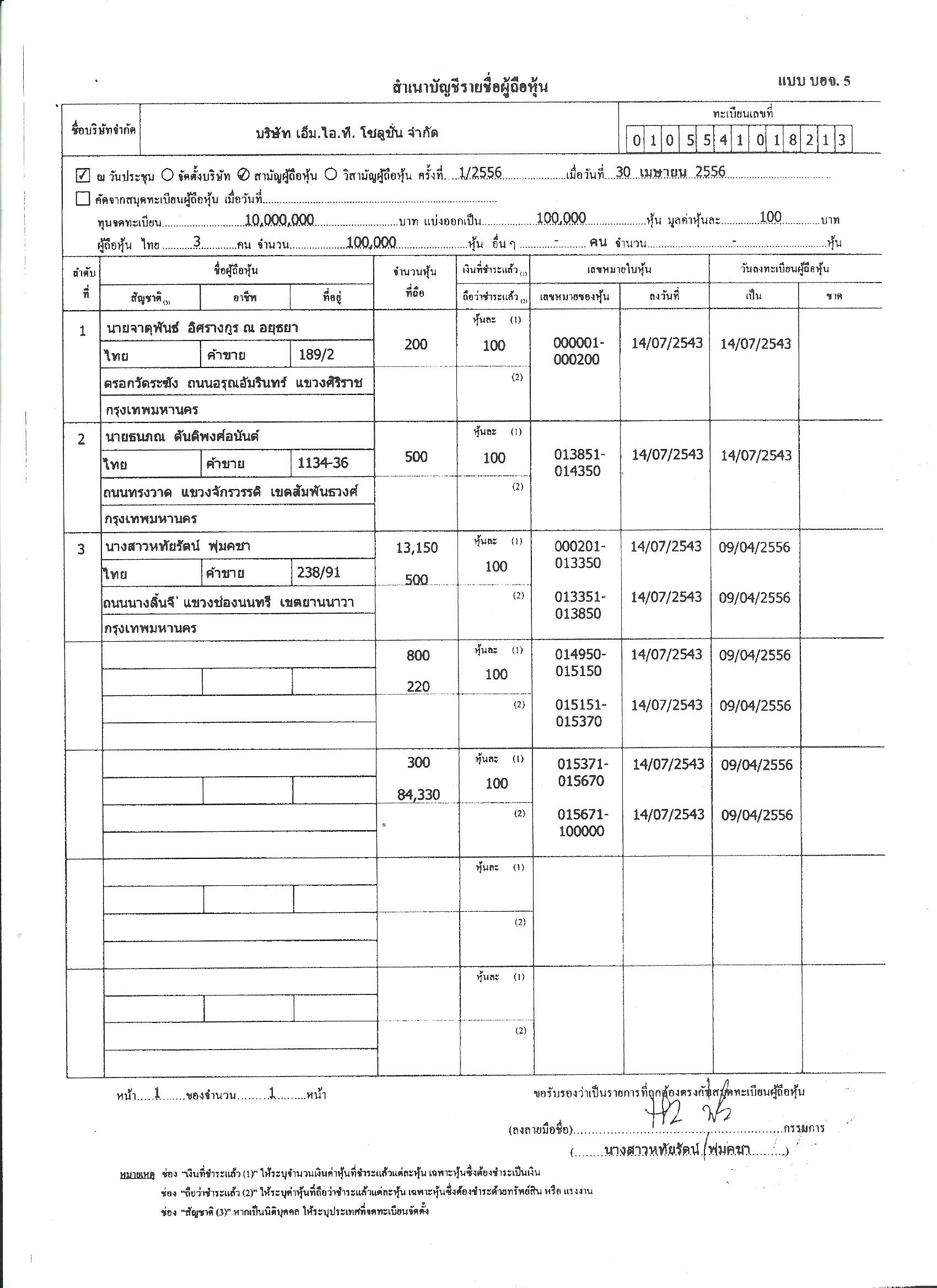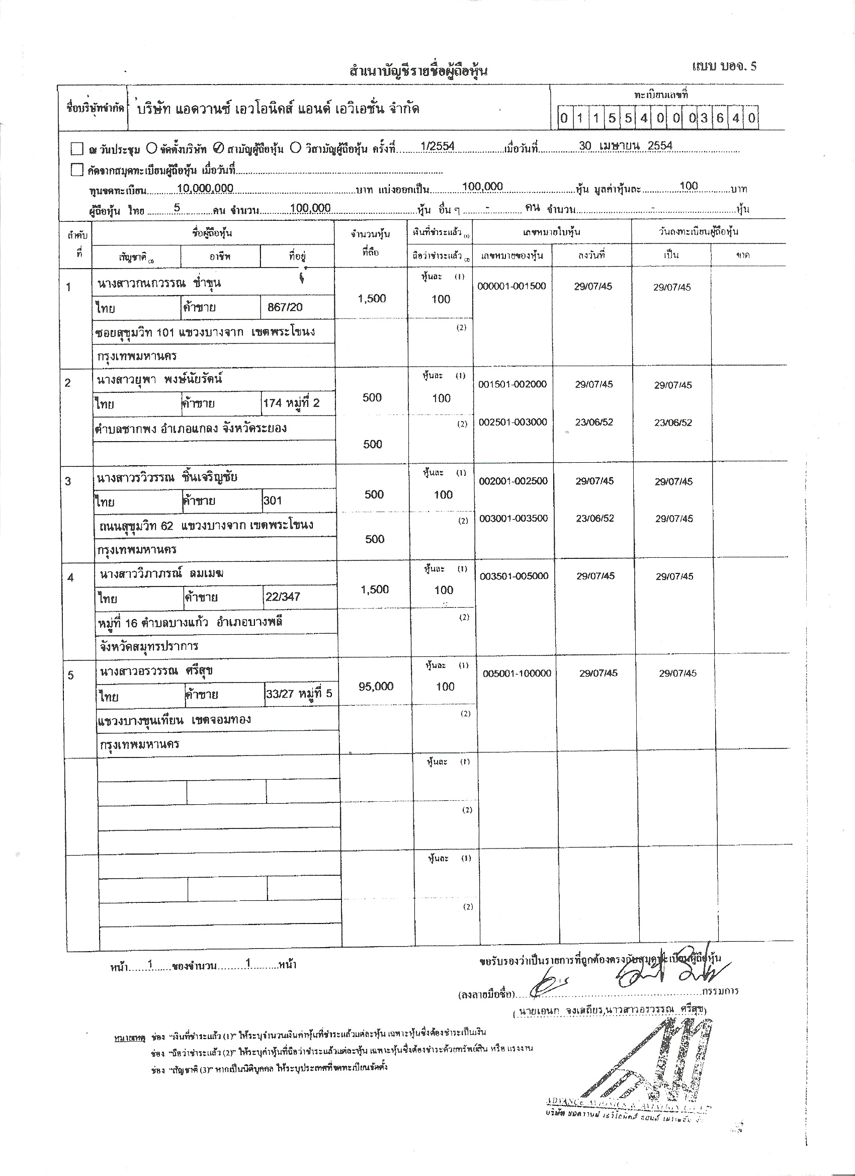 ณ วันที่ 30 เม.ย.54 น.ส.กนกวรรณ ข่ำขุน ถือ 1,500 หุ้น น.ส.วิภาภรณ์ ลมเมฆ 1,500 หุ้น จากทั้งหมด 100,000 หุ้น มูลค่าหุ้นละ 100 บาท