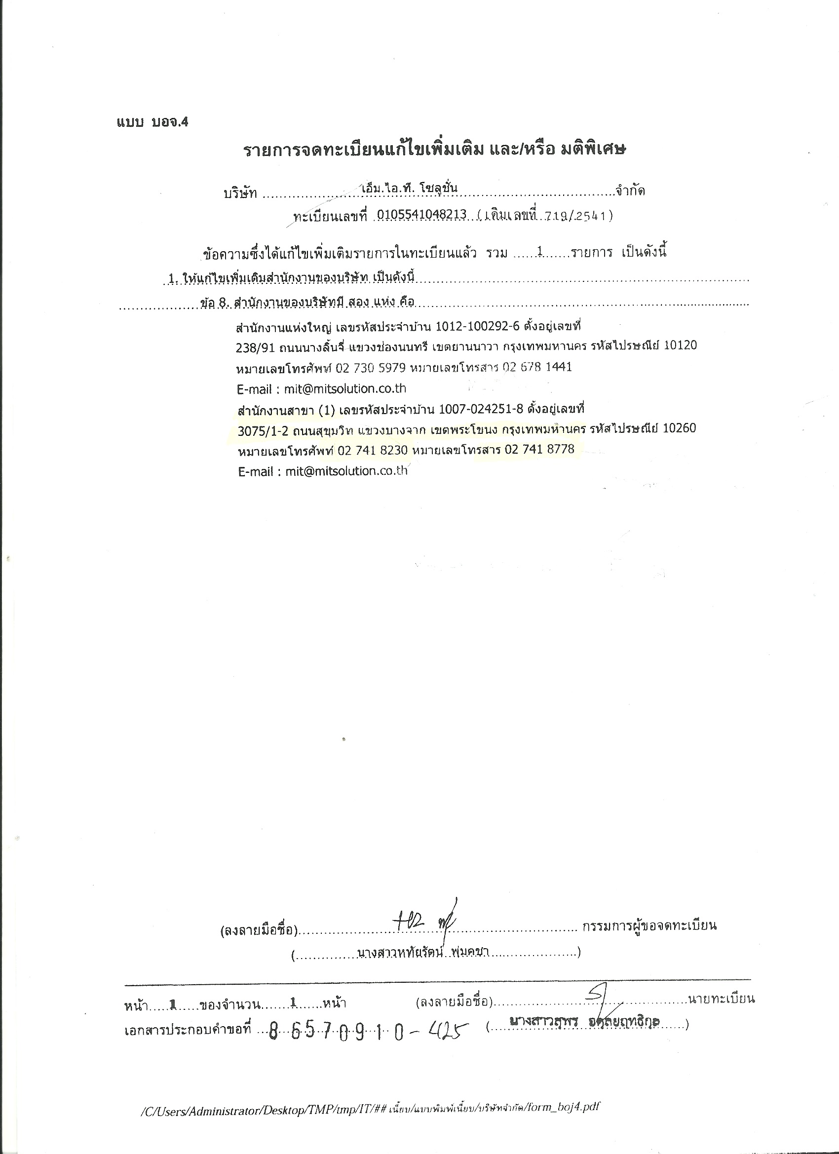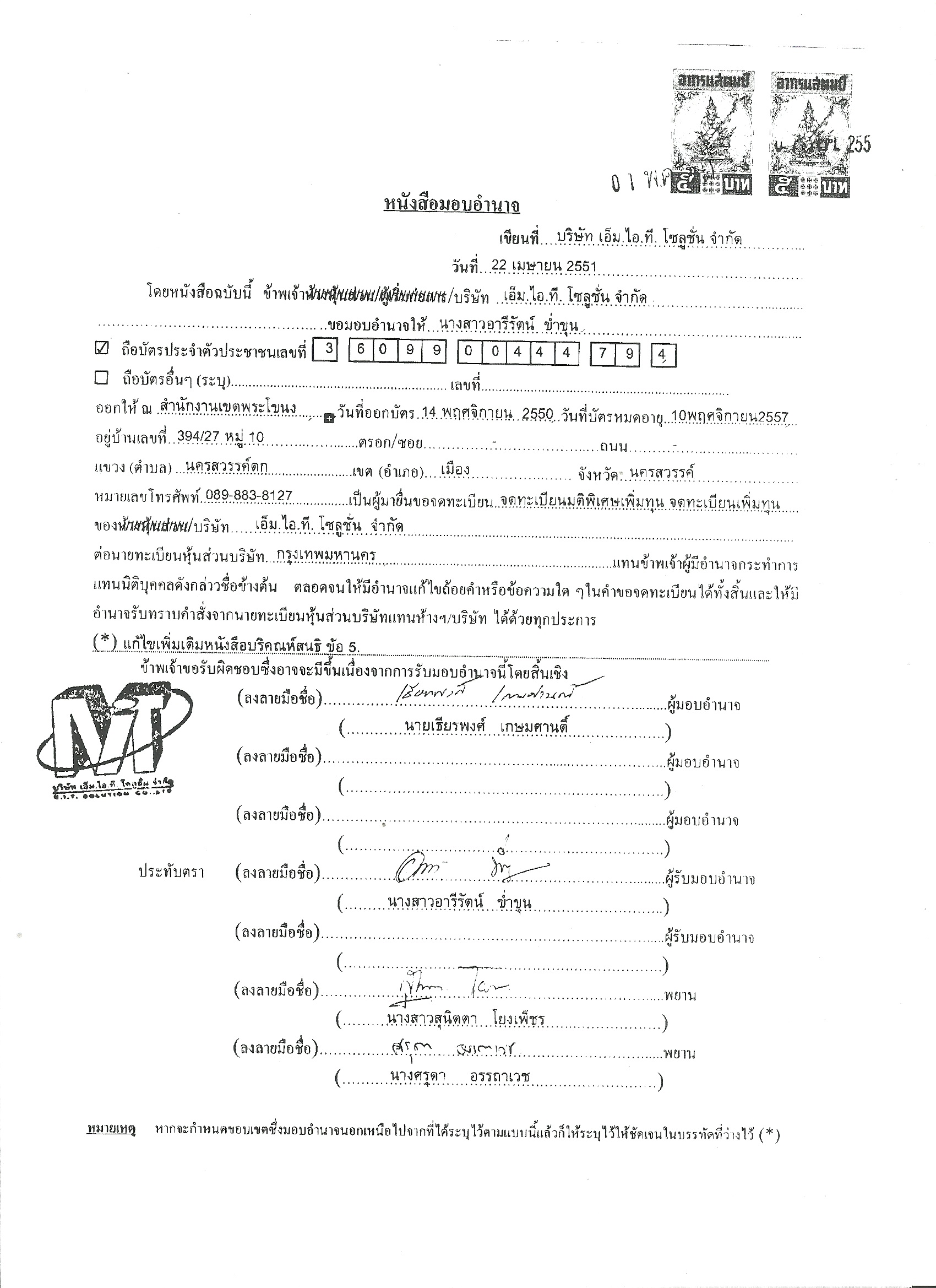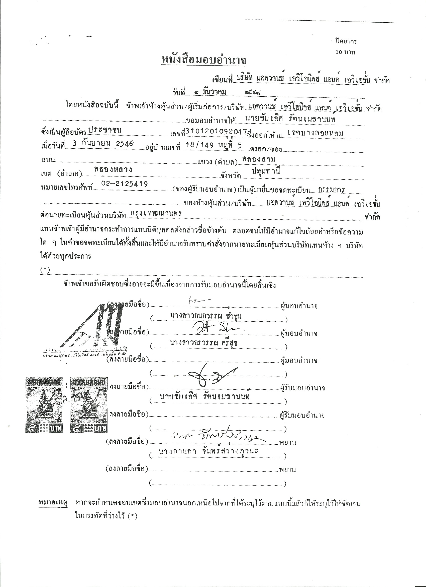 เอกสารระบุว่า นายเธียรพงศ์ และ น.ส.หทัยรัตน์ ในฐานะกรรมการ มอบอำนาจให้ น.ส.วนิดา ศรีนาราง ยื่นจดทะเบียนแก้ไขเพิ่มเติมกรรมการต่อนายทะเบียนหุ้นส่วนบริษัทกรุงเทพมหานคร โดยมี น.ส.วิภาภรณ์ ลมเมฆ ลงลายมือชื่อเป็นพยาน