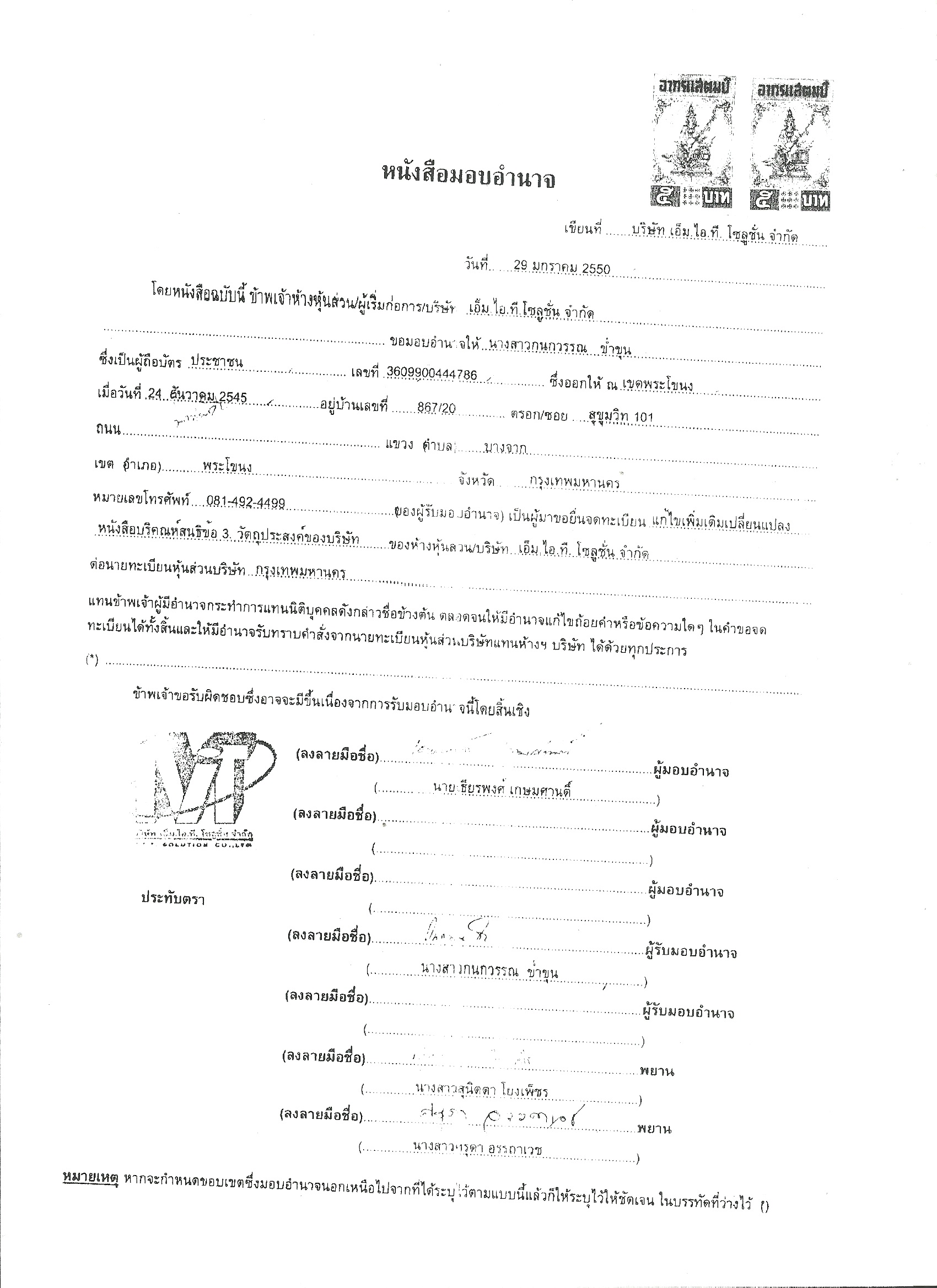 29 ม.ค.50 นายเธียรพงศ์ เกษมศานต์ ในฐานะกรรมการบริษัทฯ มอบอำนาจให้ “น.ส.กนกวรรณ ข่ำขุน” อยู่บ้านเลขที่ 867/20 ซอยสุขุมวิท 101 แขวงบางจาก เขตพระโขนง กรุงเทพฯ เป็น “ผู้รับมอบอำนาจ”ในการยื่นจดทะเบียนแก้ไขวัตถุประสงค์ของบริษัทฯ ต่อนายทะเบียนหุ้นส่วนบริษัทกรุงเทพมหานคร