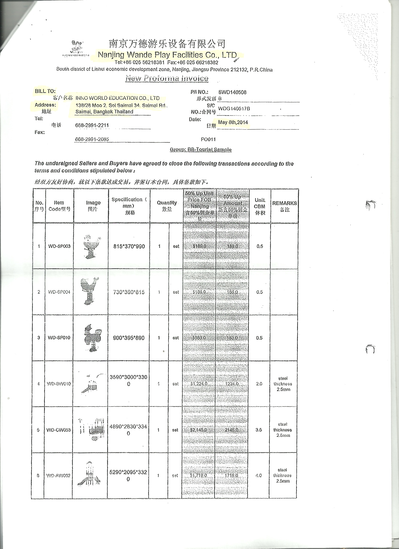 สินค้าตามที่ระบุว่า ในใบแจ้งราคา” หรือ Invoice ของ Nanjing Wande Play Facilities Co.,Ltd ส่ง มายัง บริษัท อินโนเวิลด์เอ็ดดูเคชั่น จำกัด วันที่ 8 พ.ค.57 ระบุสินค้า 24 รายการ วงเงิน 30,988.50 ดอลล่าร์สหรัฐ (อัตราแลกเปลี่ยนอยู่ที่ 32.51 บาท) คิดเป็นเงินไทย 1,007,836.14 บาท (รวมค่าธรรมเนียม) โดยสินค้าแต่ละชนิดมีรหัสสินค้ากำกับ (ดูเอกสาร)