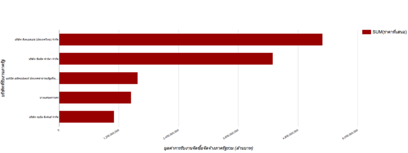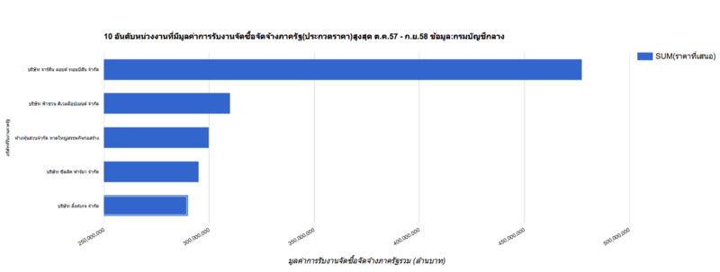 บริษัทที่ได้งานจัดซื้อ จัดจ้าง จากหน่วยงานรัฐผ่านวิธีการ ประกวดราคา ช่วง ต.ค. 57 - ก.ค. 58 เป็นมูลค่าสูงสุด 5 อันดับแรกมีดังนี้