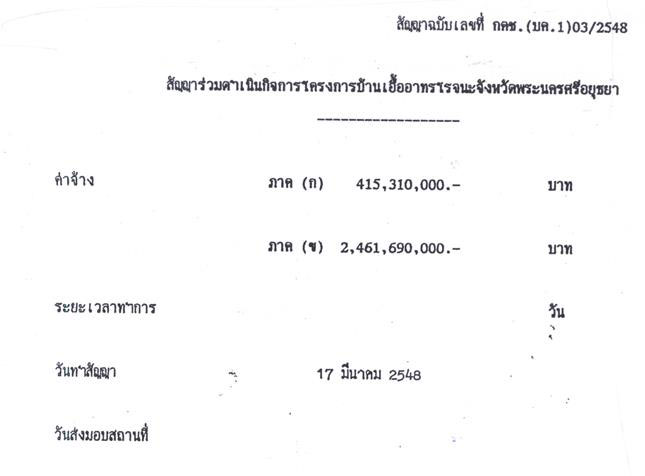 โครงการศรีอินทราทิตย์ จ.ลพบุรี การเคหะฯว่าจ้างระบบเทิร์นคีย์กับผู้รับเหมาของอดีตรัฐมนตรีคนหนึ่ง วงเงิน 432.6 ล้านบาท แบ่งเป็นค่าที่ดิน 104 ไร่ 62.4 ล้านบาท หรือราคาไร่ละ 600,000 บาท แต่ราคาต้นทุนที่ผู้รับเหมาซื้อจากชาวบ้นจริงๆ ในราคาเพียงไร่ละ 250,000 บาท เท่ากับมีการพอกส่วนต่างกว่าเท่าตัว
